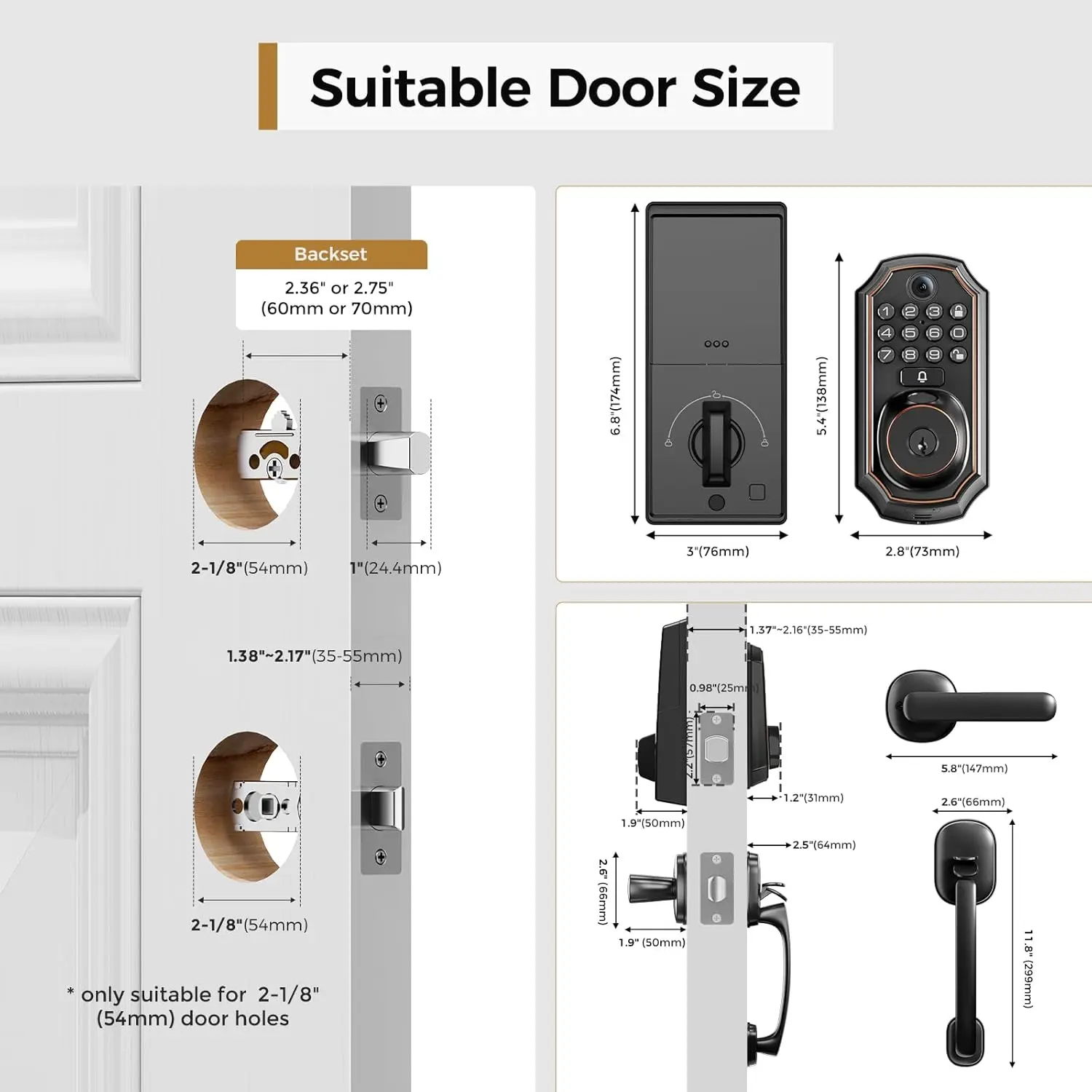Two-way Audio: Smart door lock with camera provide a 130 wide-angle lens, video and image. Visitor presses the doorbell button, Built-in two-way microphone and speaker allow you to make smooth and clear two-waycalls to visitors at your door.