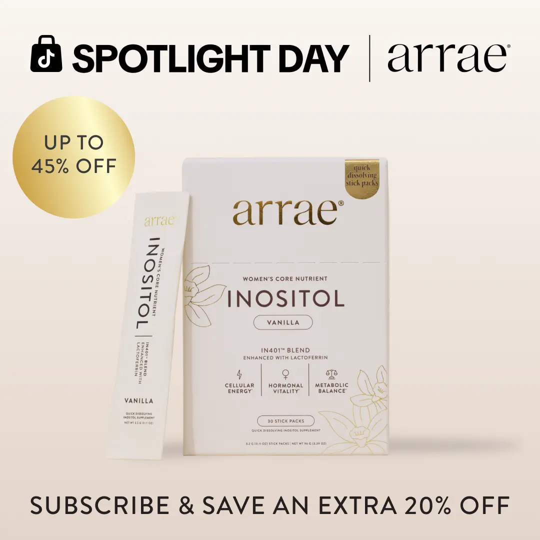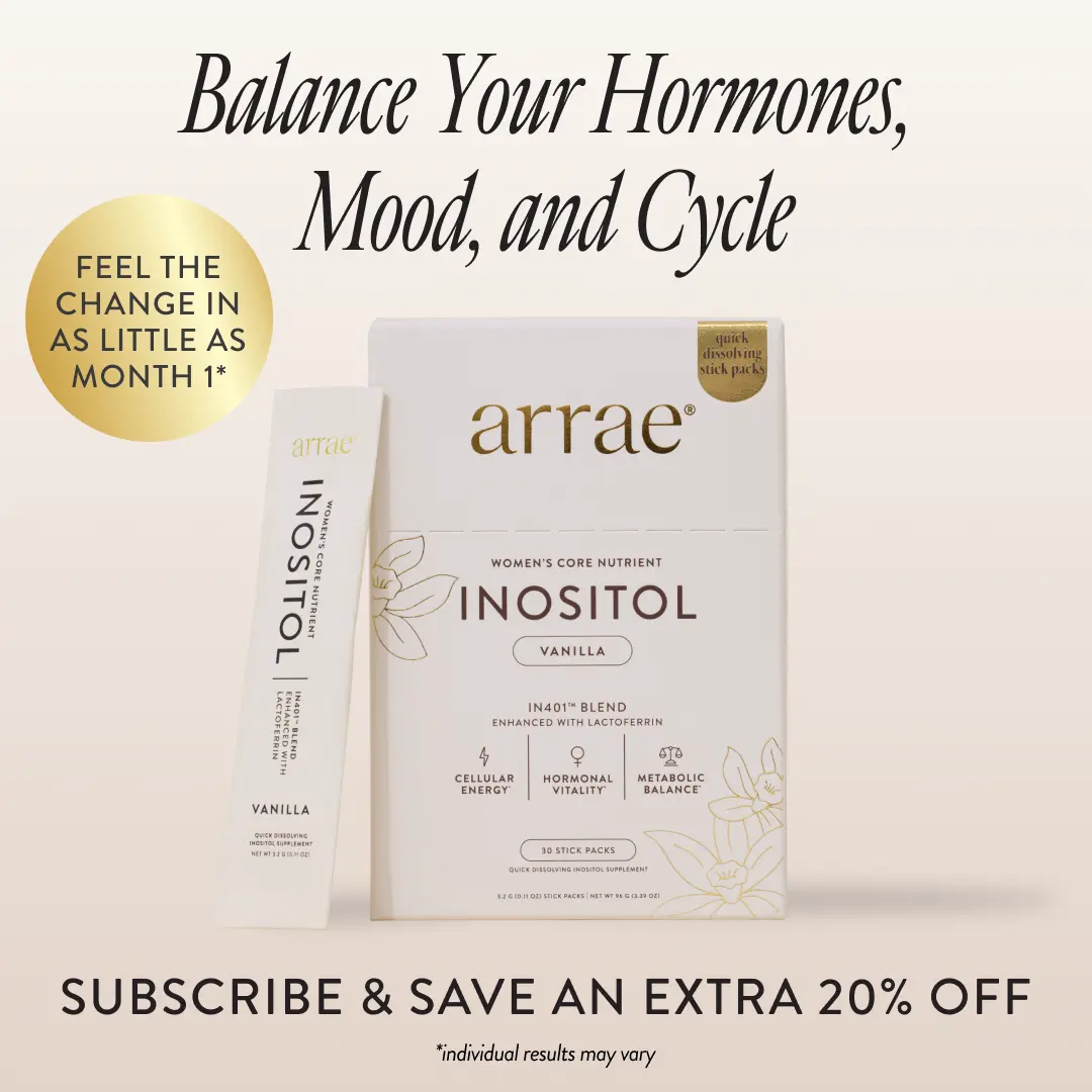 Arrae Inositol is our daily women’s core nutrient designed to support overall wellness from the inside out. Featuring our IN401 blend of 40:1 inositol paired with lactoferrin plus active folate, Inositol is designed to restore the communication between your body and your hormones for cycle wellness, metabolic balance and cellular energy in one daily ritual.