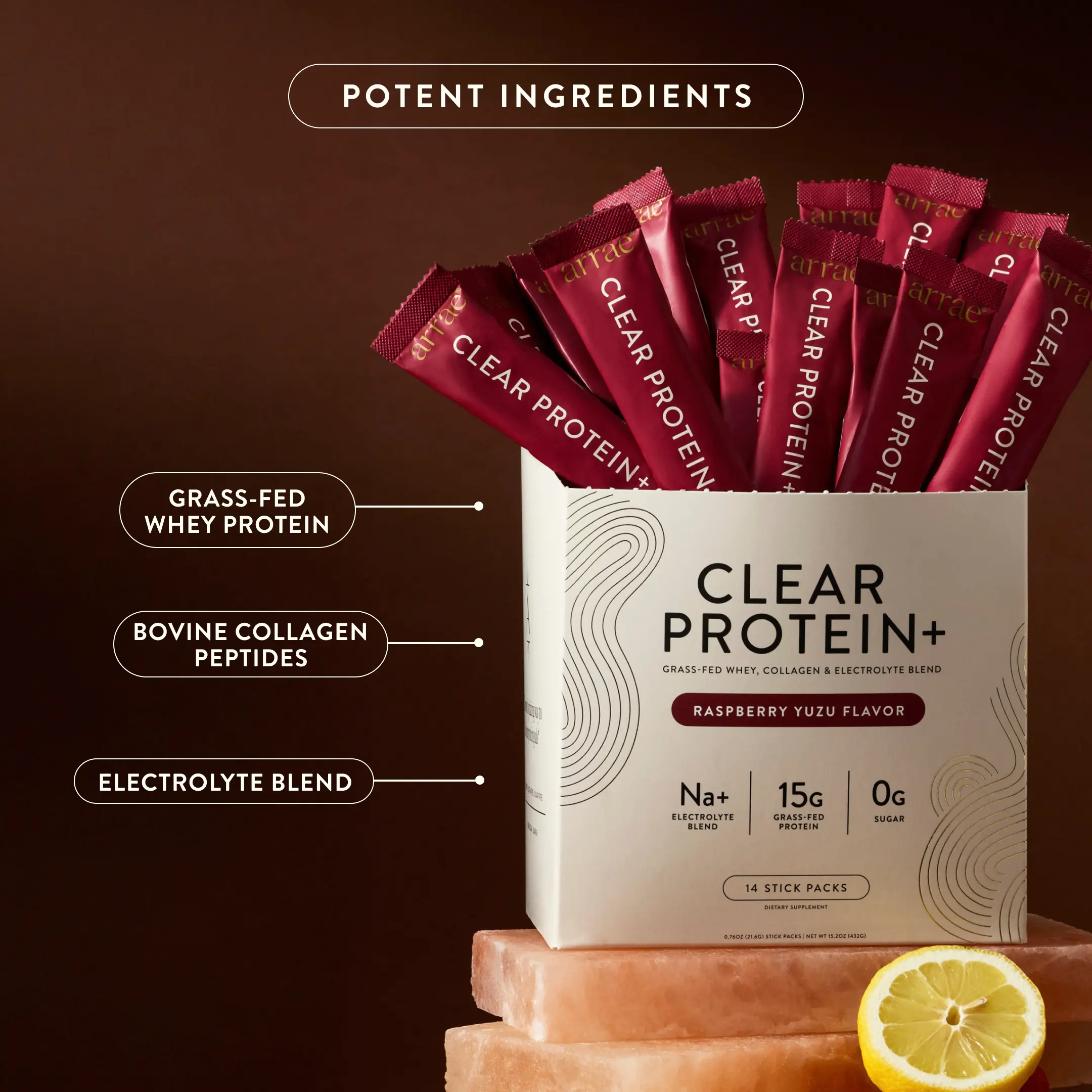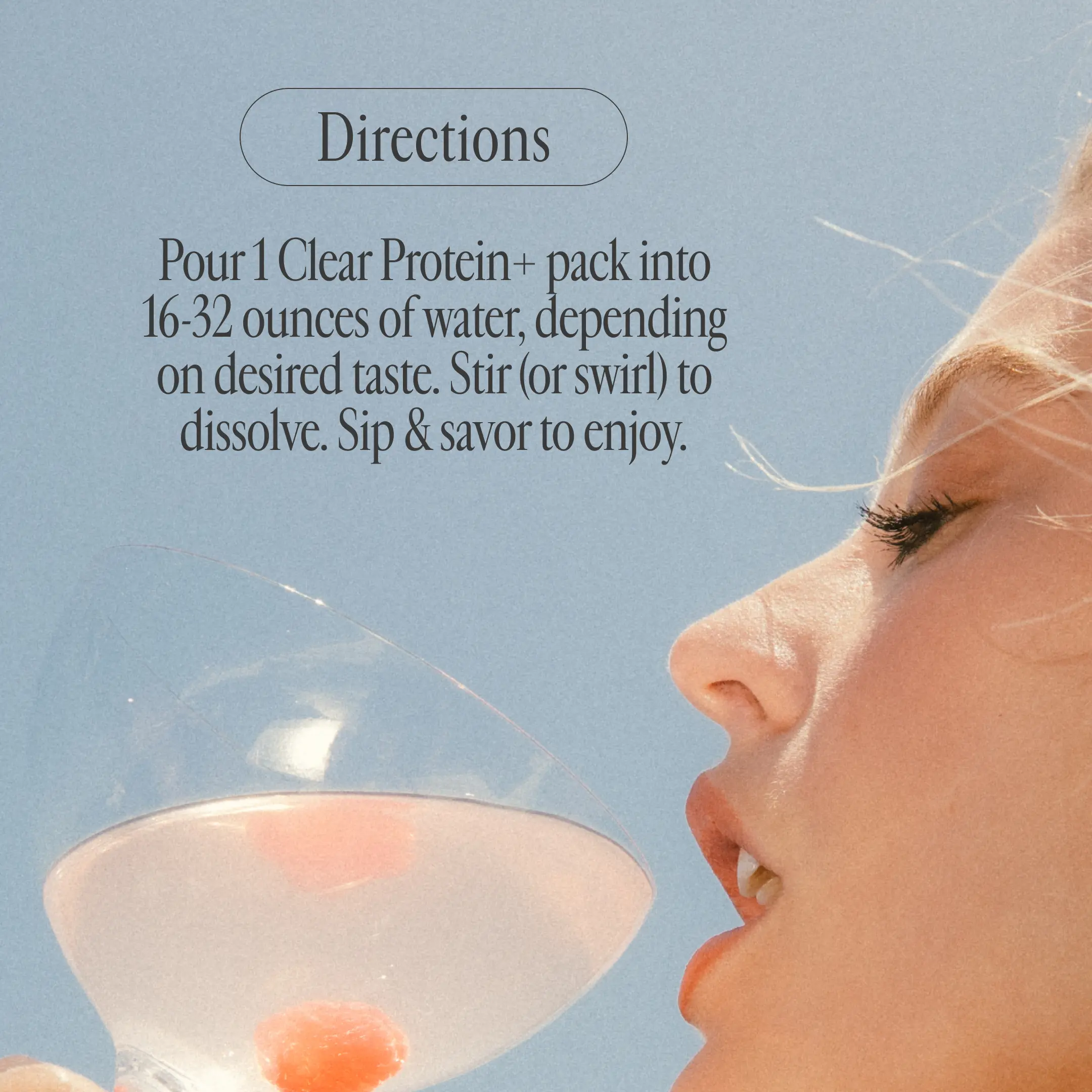How to use: Take 2 capsules daily in the morning or before your workout for optimal results. We recommend taking for 3 months consistently to see full results. Pour 1 Clear Protein+ stick pack in 16-32oz of water, depending on desired taste.