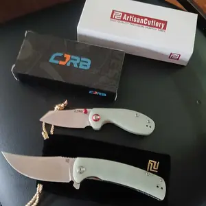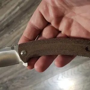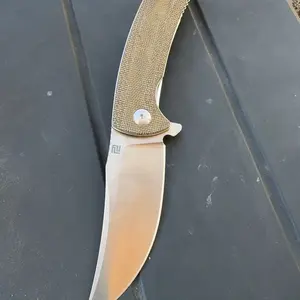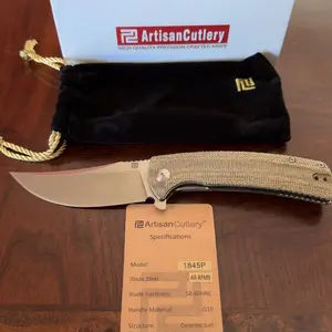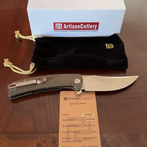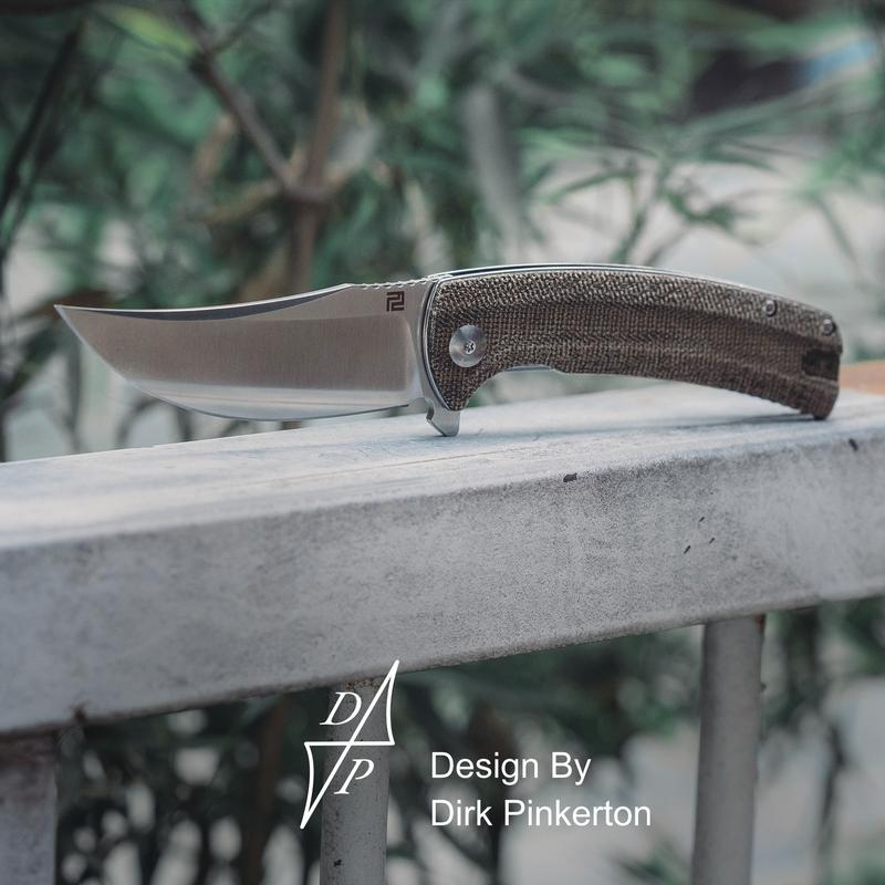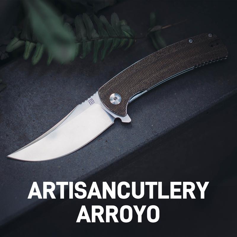 The Arroyo is a compact flipper from Artisan Cutlery designed by Dirk Pinkerton. The aggressively designed blade has a large upswept profile that is great for self-defense but excels at most cutting tasks. It is made from proprietary steel by CJRB and Artisan called AR-RPM9 that takes the best qualities of D2 and stainless to make budget steel that really holds up. The blade is deployed quickly thanks to the ceramic ball bearings in the pivot and is secured via the liner lock built into the handle. The handles themselves are made from milled G10 that have a light texturing that really helps with the grip. The knife comes with a stainless steel pocket clip that is reversible to accommodate right and left-handed people.