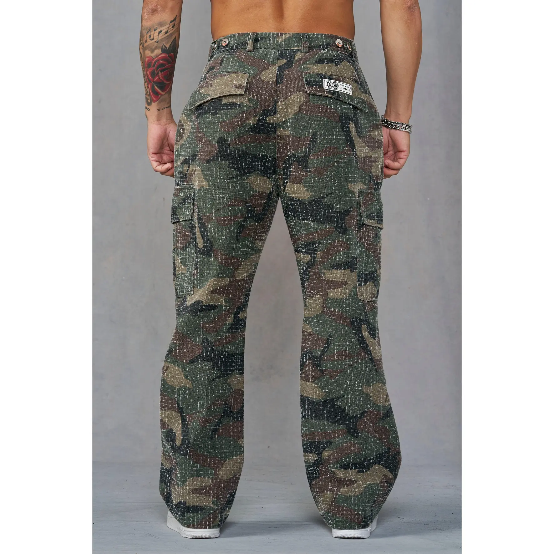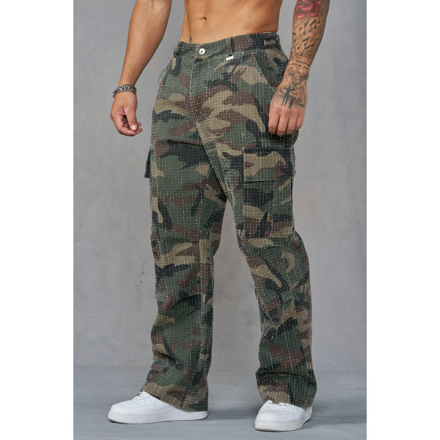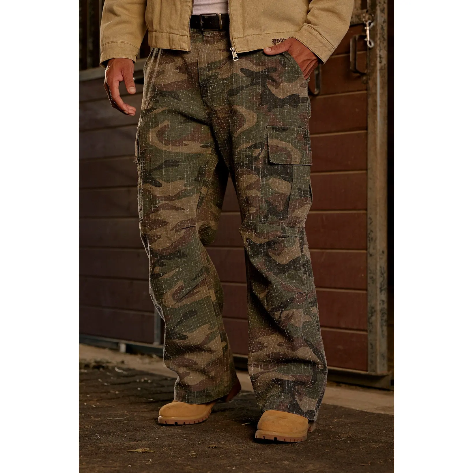 DESIGN: These cargos blend a rugged military look with a clean straight-leg silhouette. The fabric features a subtle grid-stitch texture that adds depth and a worn-in edge, while dual cargo pockets bring utility without bulk. Finished with classic belt loops and a button-zip waist for a tough, understated look.