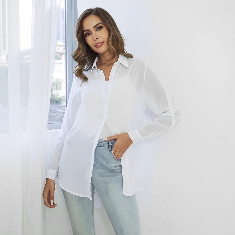 Features: Sexy sheer button down blouses for women, sheer mesh, button front, long sleeve, collar neck, tunic longline, blouse shirt tops, midi length can cover your hip, spring summer fall shirts top, sexy clubwear, trendy streetwear