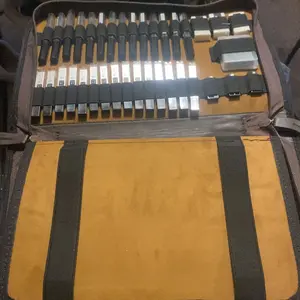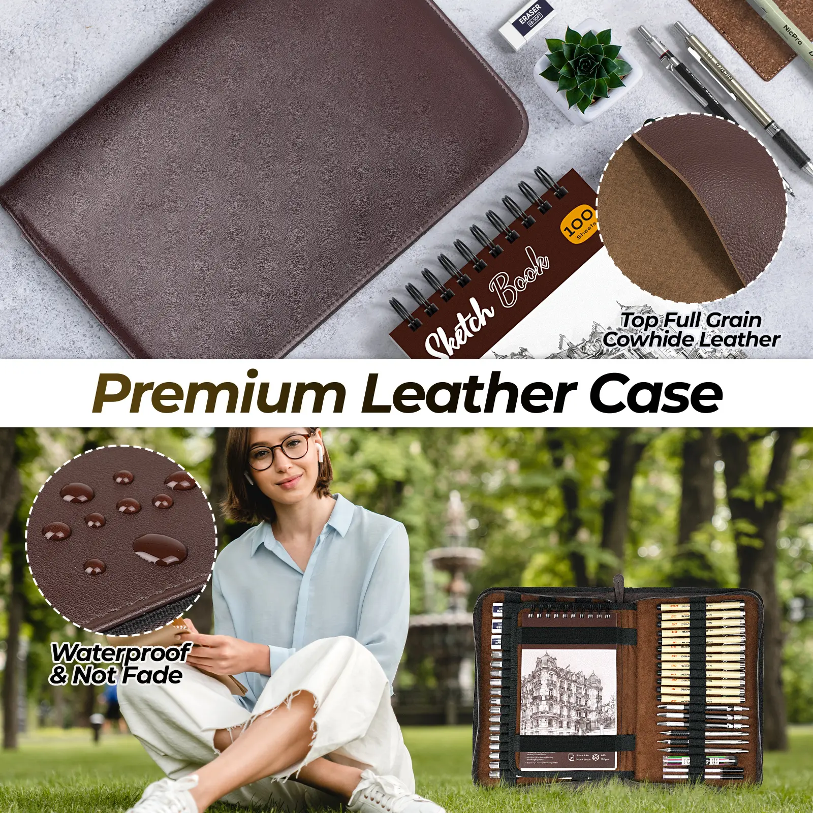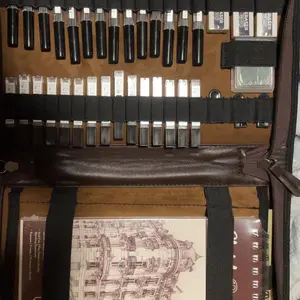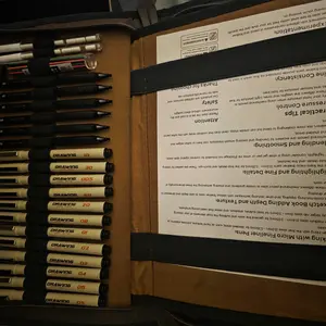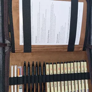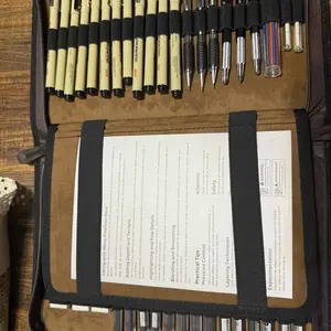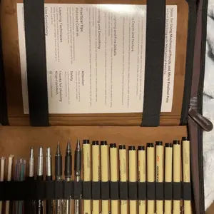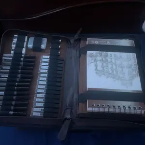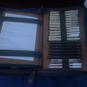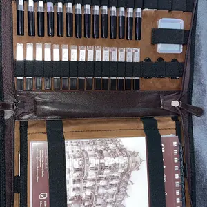 it came with all the pieces & the leatherbound case doesn't feel like pleather! the pens are many and look/feel like micron pens for half the price!! the pencils are solid metal and this comes with enough erasers+lead sticks to LAST. 10/10 for me, can't recommend enough!!!!