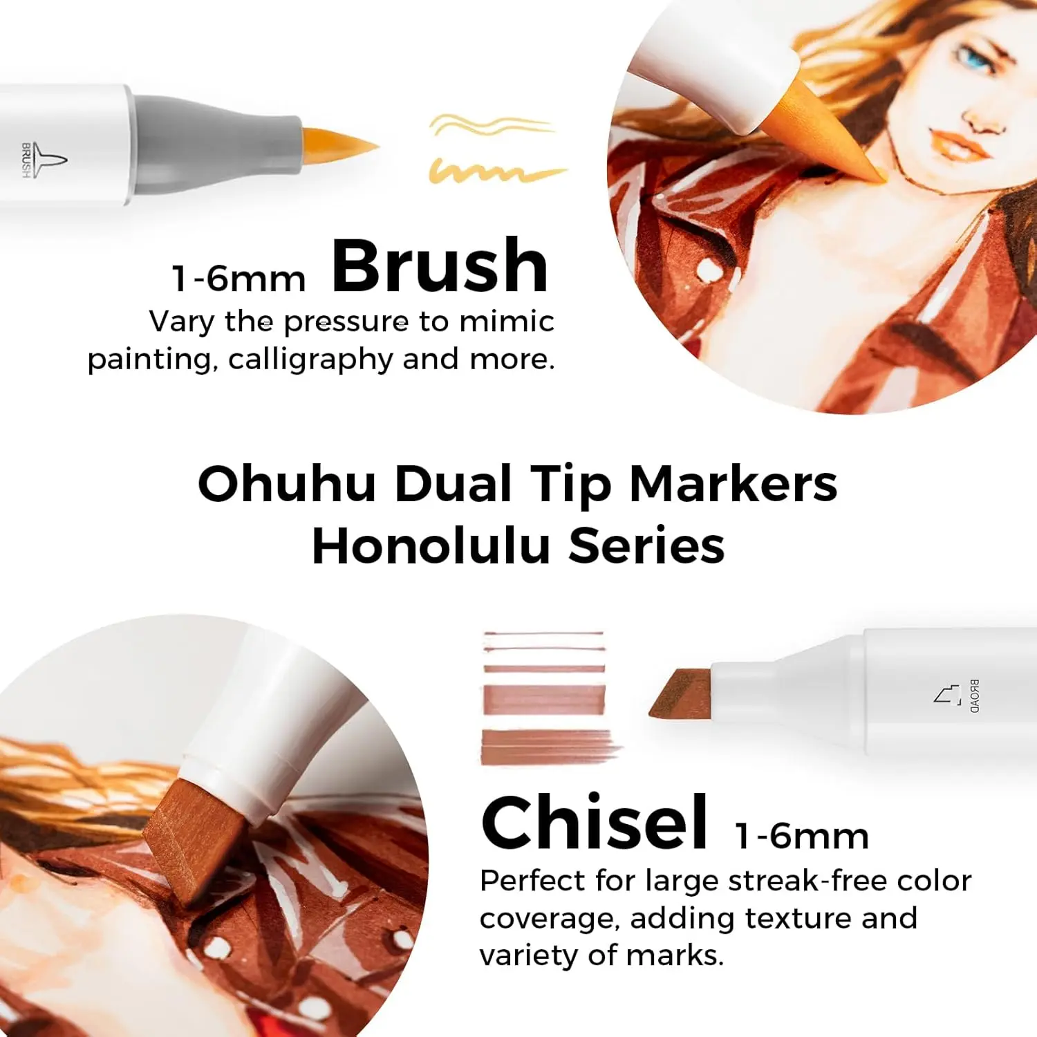The chisel tip is perfect for large area color coverage while the brush tip is ideal for sweeping, shading and calligraphic strokes.