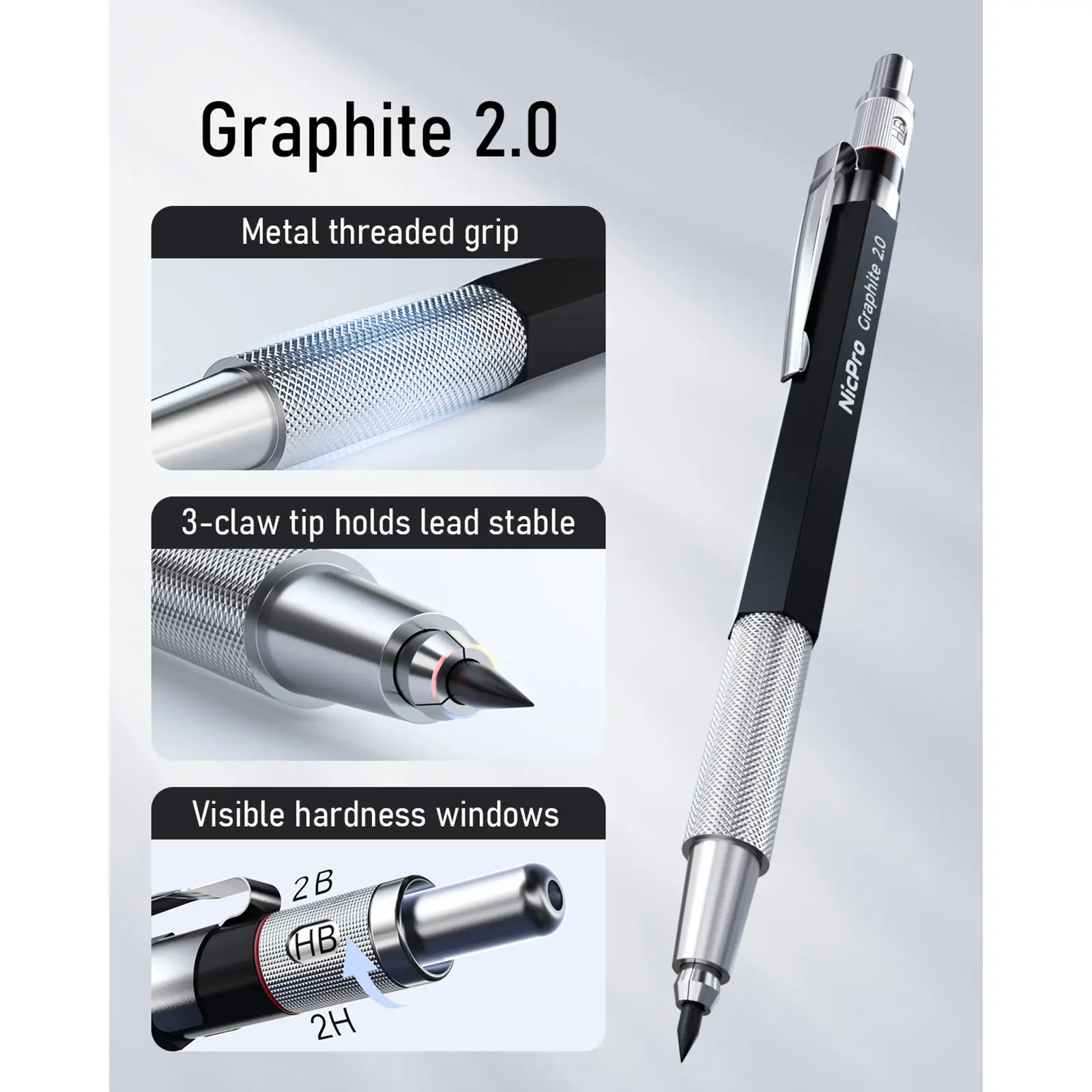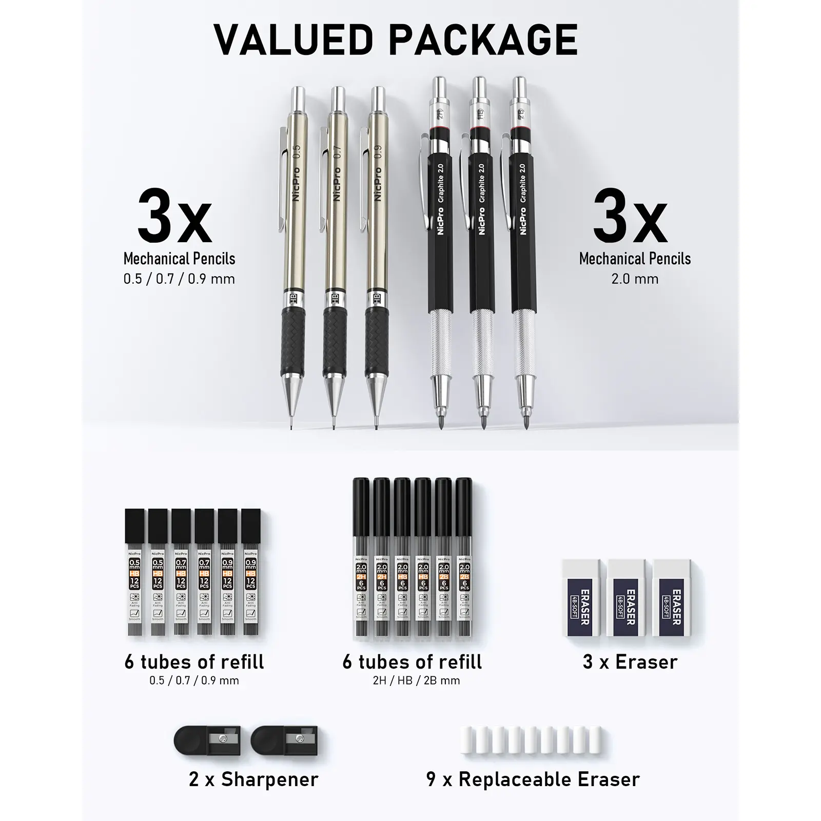 This Nicpro set includes 3Pack Metal Drafting Pencils in 0.5 mm, 0.7 mm, and 0.9 mm. It also comes with 3Pack 2mm Graphite Lead Holders (2B, HB, 2H). Ideal for writing, sketching, and drawing. Comes with lead refills and a case for easy storage.