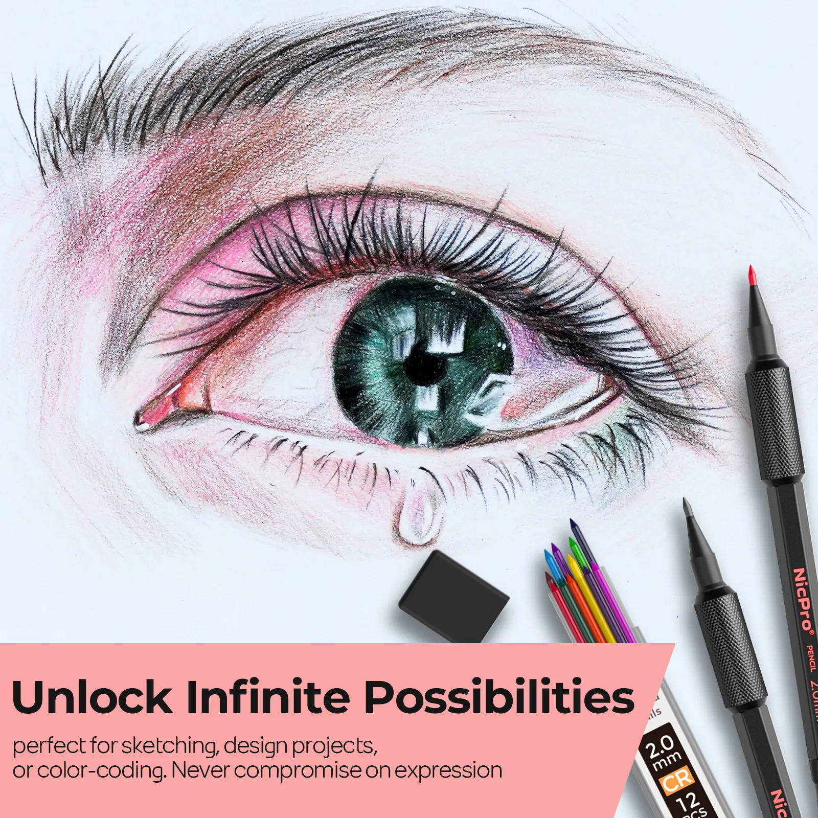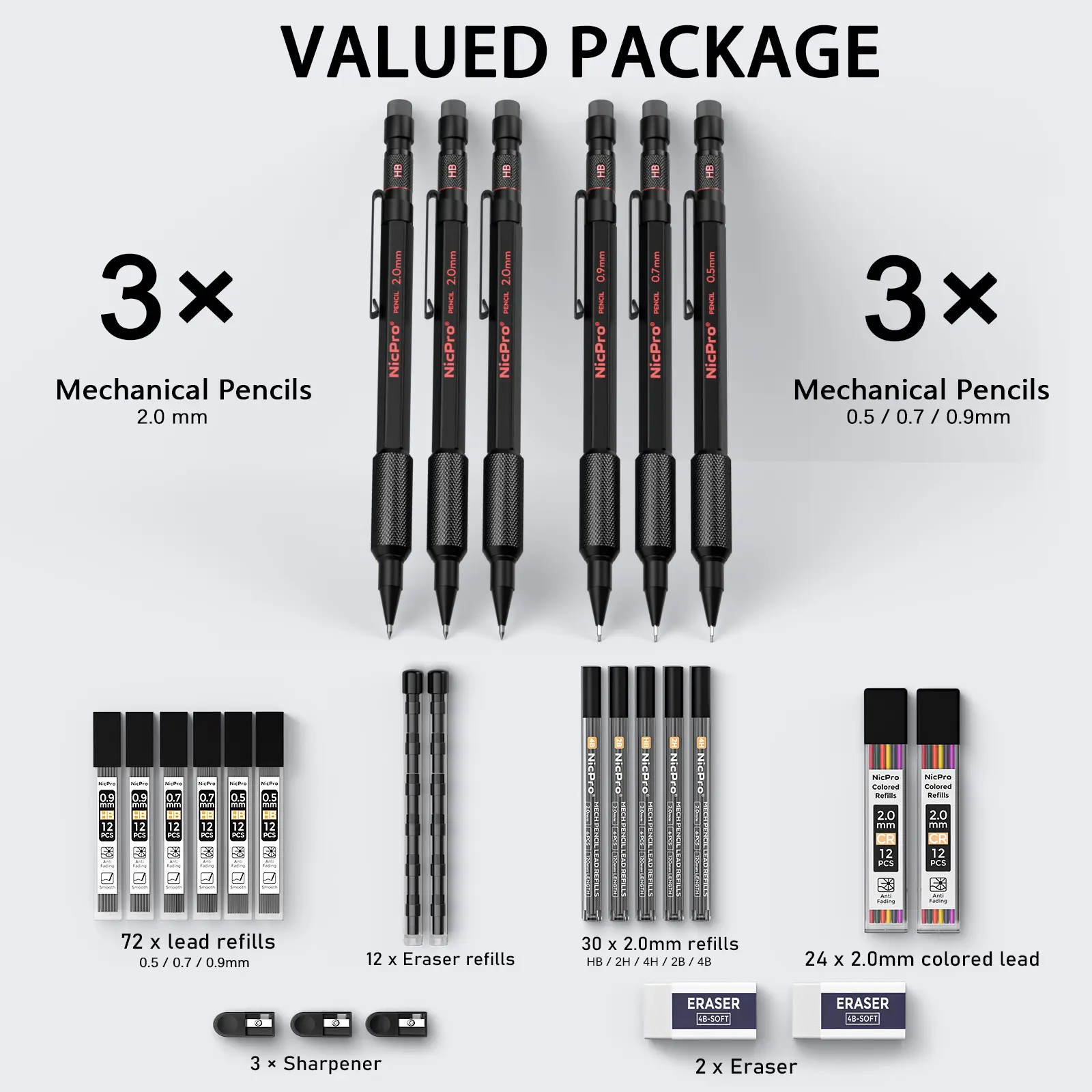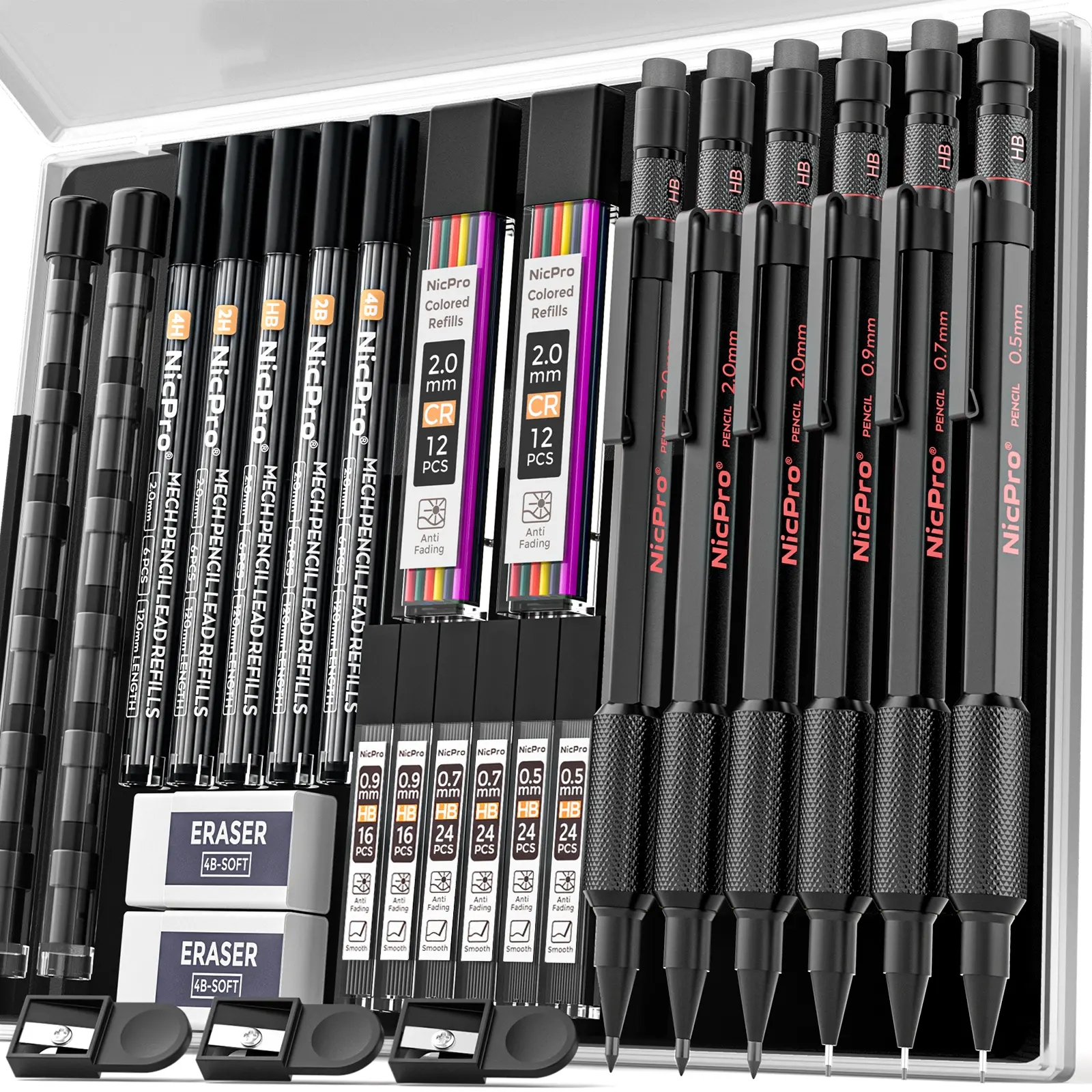 This Nicpro set includes 35 pieces: 0.5, 0.7, 0.9, 1.3 mm & 2mm pencils. It comes with 21 lead refills (6B, 4B, 2B, HB, 2H, 4H colors). The weatherproof barrel ensures durability for outdoor use. Ideal for writing, drawing, and sketching.