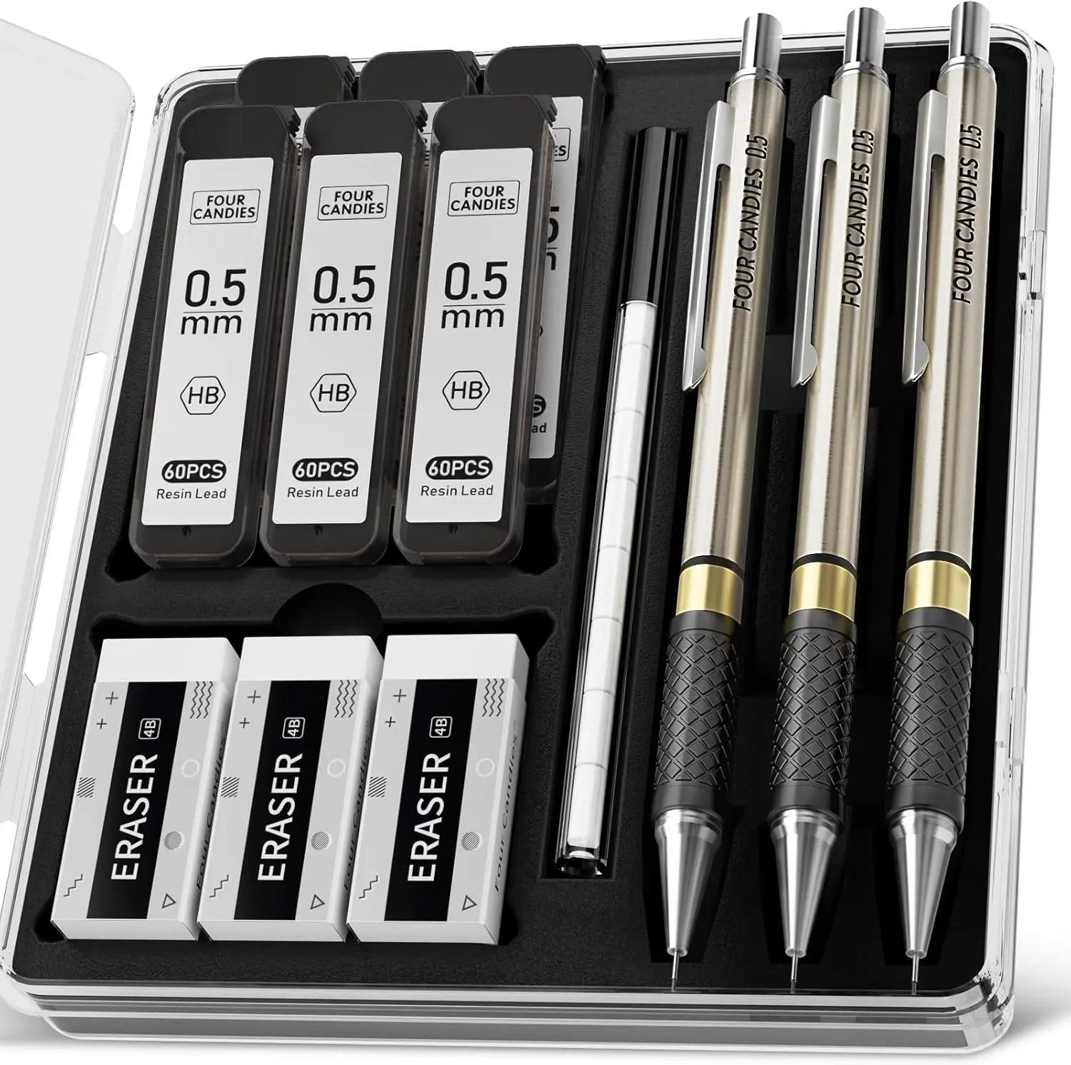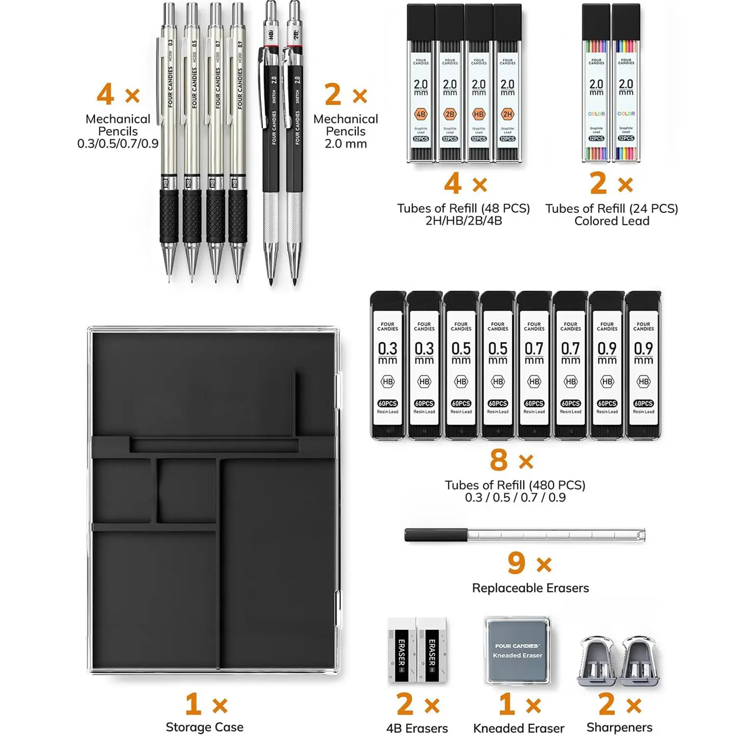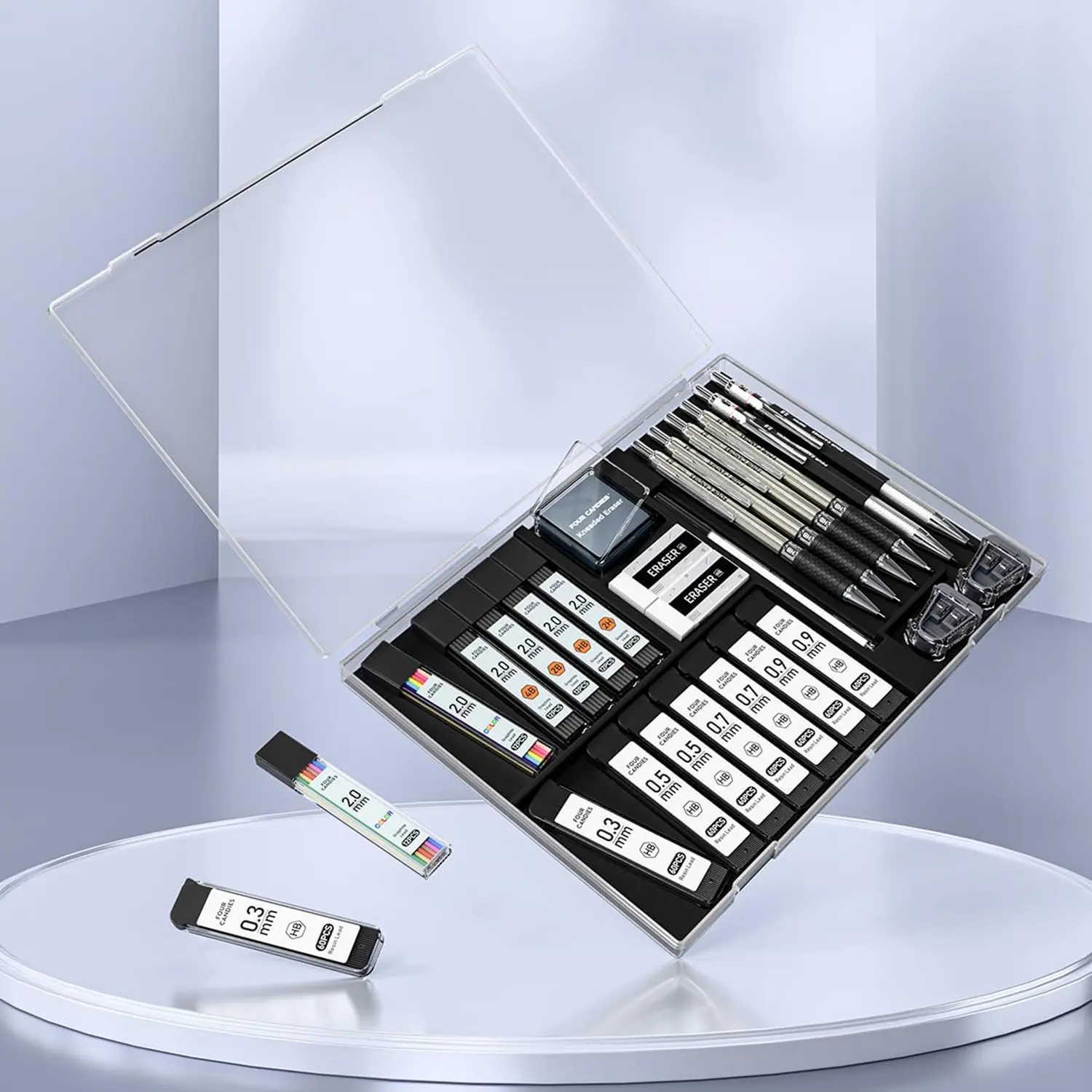·【Exquisite Artist Set】Includes 6 metal mechanical pencils in 0.3mm 0.5mm 0.7mm 0.9mm and 2.0mm sizes, 20 tubes of lead refills with various diameters and hardness levels, 2 soft 4B erasers, 1 kneaded eraser, 9 cap eraser refills, 2 lead sharpeners, and a durable storage case.