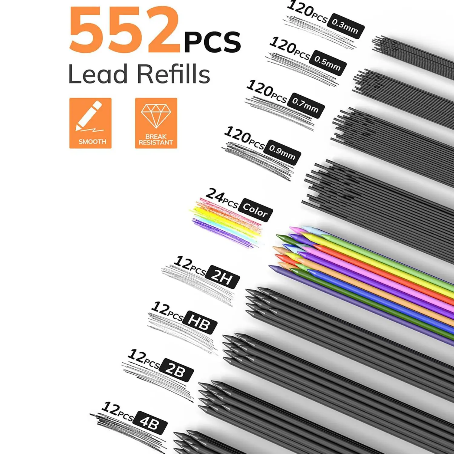 ·【Various Types of Lead Refills】The set has appropriate hardness & smooth lead refill for your daily art writing and drafting. 480PCS black HB lead refill 0.3 & 0.5 & 0.7 & 0.9 mm. 48 PCS 2mm of different hardness( 2B HB 2H 4B)&24PCS 12 assorted colors graphite lead refills lead refills for art shading