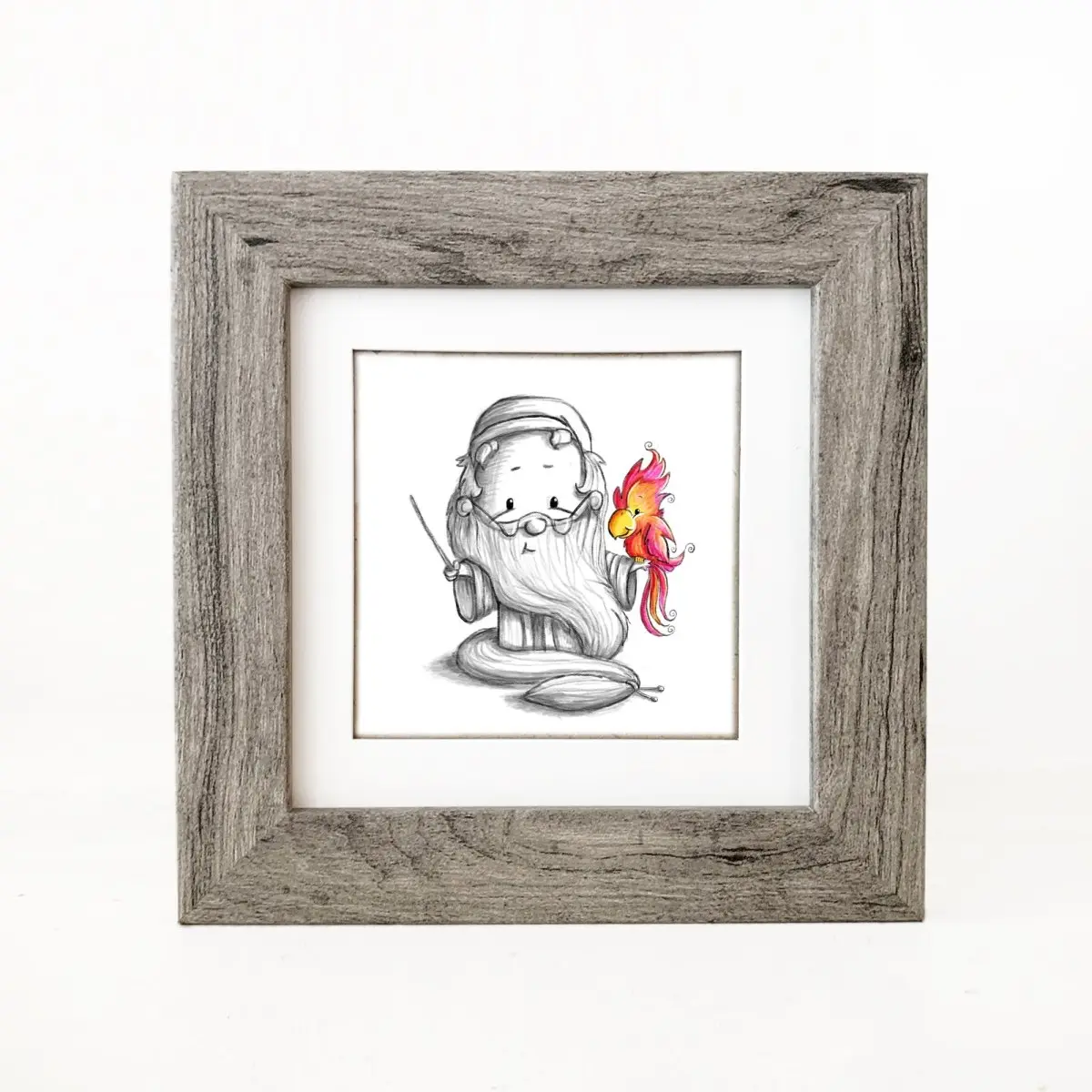 ·7x7” inch gray frame matted to 4x4" with wall hook and fold-out easel attached to frame backing.