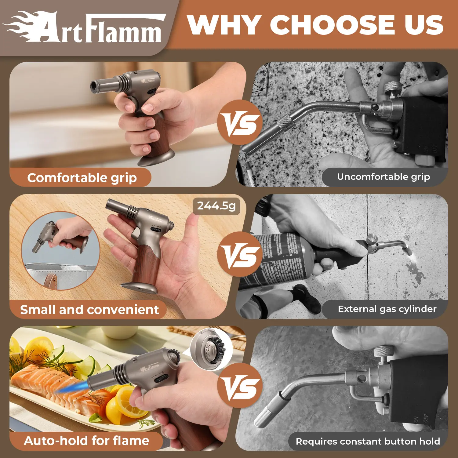 Intense Fire Power: The extreme dual flame lighter styles of Artflamm’s hand torch match your burning passion. Switching from lighting a candle to roasting meat is as easy as sliding the kitchen torch’s switch from left to right. Lock down the ignition button to keep the flame burning.