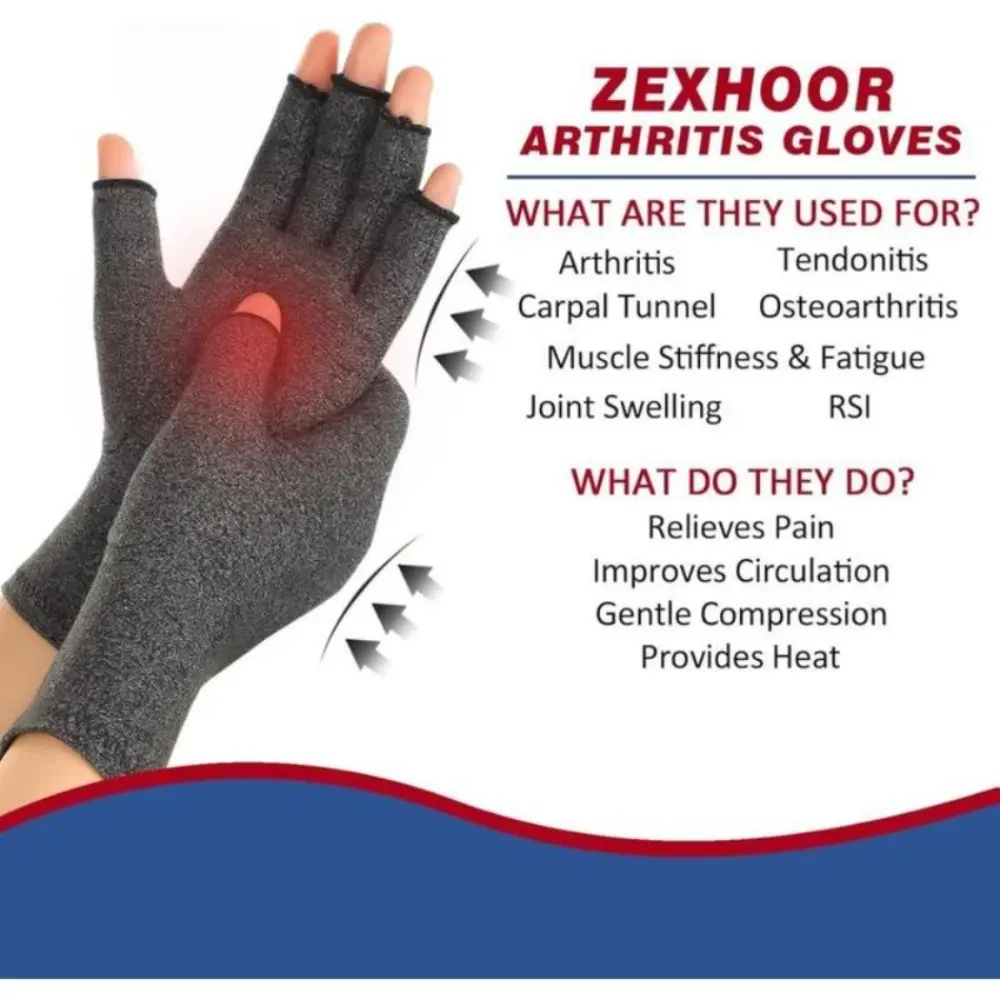 Fingerless Design for Everyday Use Arthritis gloves feature an open finger design, perfect for typing, using phones, cooking, and driving. The thumb sleeve length offers optimal compression support and finger movement balance. This design ensures you can perform daily tasks effortlessly while managing arthritis pain. Effective Pain Relief These gloves provide constant, gentle compression for hand pain relief. They soothe arthritis, carpal tunnel, tendonitis, rheumatoid, RSI, and joint stiffness. Enhanced blood circulation and faster wrist recovery are achieved with regular use. Experience relief without compromising on comfort. High-Quality Fabric Soft and comfortable, the fabric ensures long-term wear. Moisture-wicking and breathable, it keeps hands fresh on hot days. High-quality materials resist warping and withstand repeated washing. Enjoy durability and comfort throughout the day. Available in Three Sizes Zexhoor offers three sizes fitting all hand sizes. Refer to the size chart for the best fit. Choose the right size for maximum comfort and effectiveness. Customer Service Oriented Contact us if you're not satisfied. We prioritize your joint health with professional arthritis gloves. Your satisfaction is our priority!