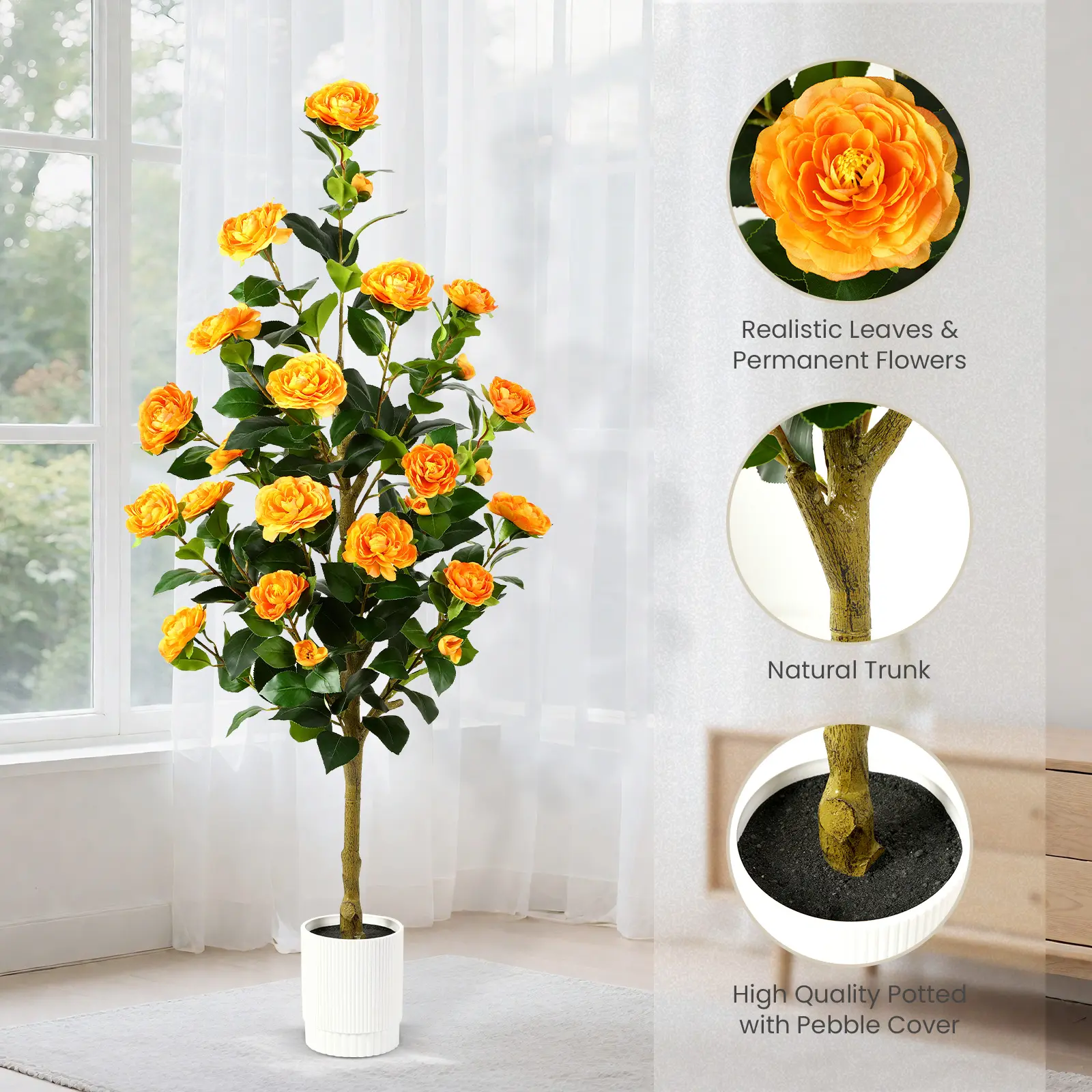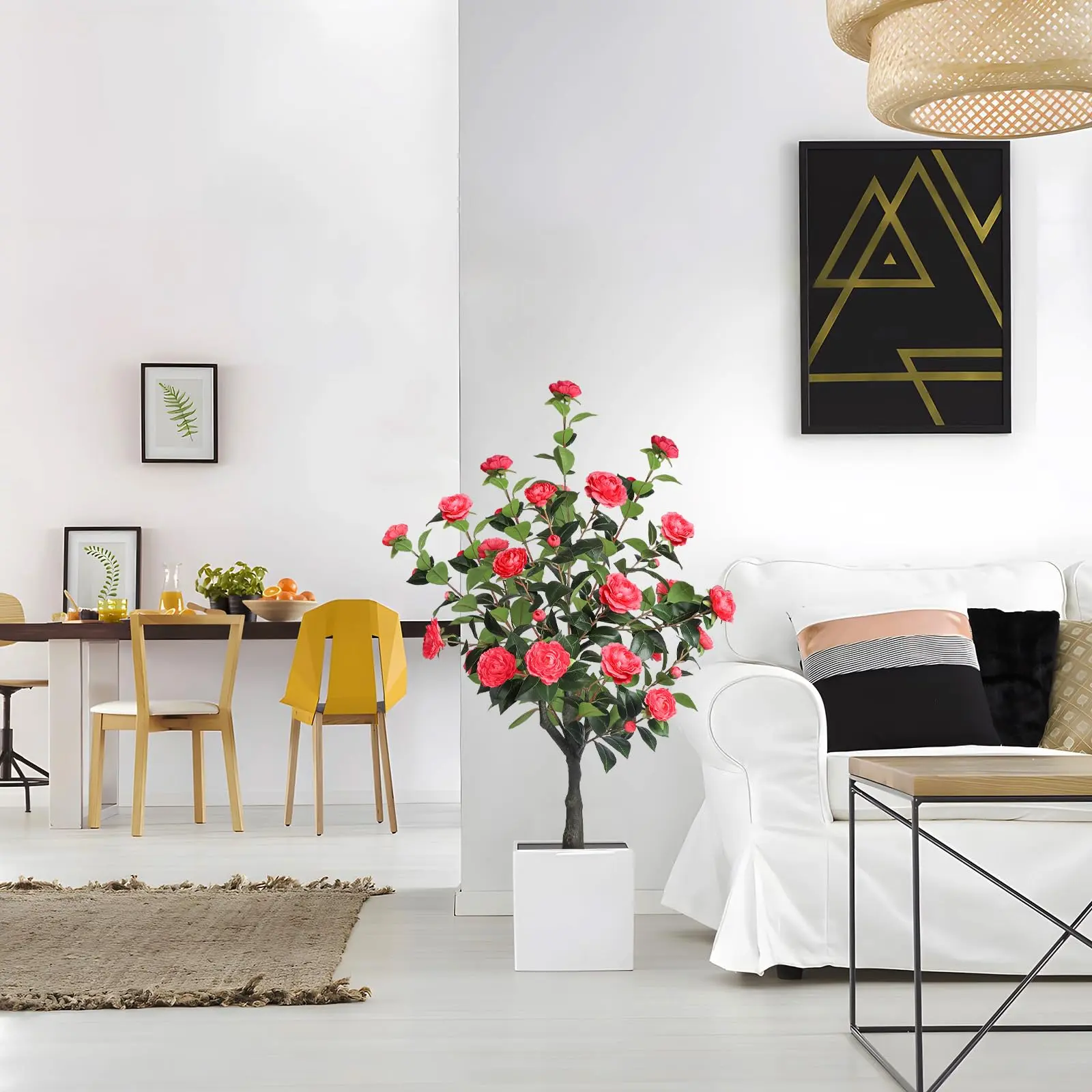 Our artificial camellia tree enhances any setting with natural beauty. It's easy to arrange the branches to suit your style. This low-maintenance plant suits busy lifestyles. Enjoy the charm of greenery without the hassle of watering or pruning. It's a perfect choice for those who value convenience.