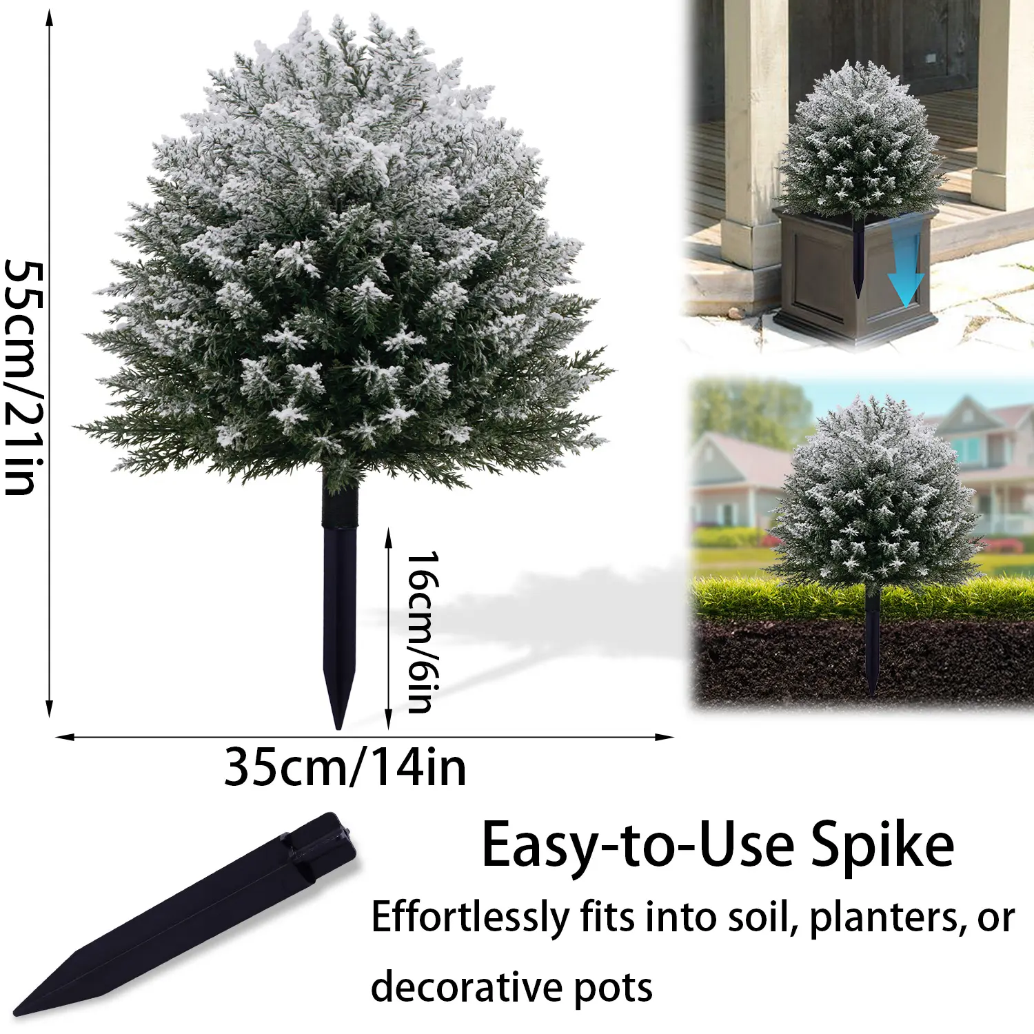 5. 1 Pack / 2 Pack Artificial Cedar Topiary Ball Trees with Spikes, 21 Inch with Snow Christmas Outdoor Decorations, UV Resistant Artificial Plants for Porch, Patio or Flower Pots