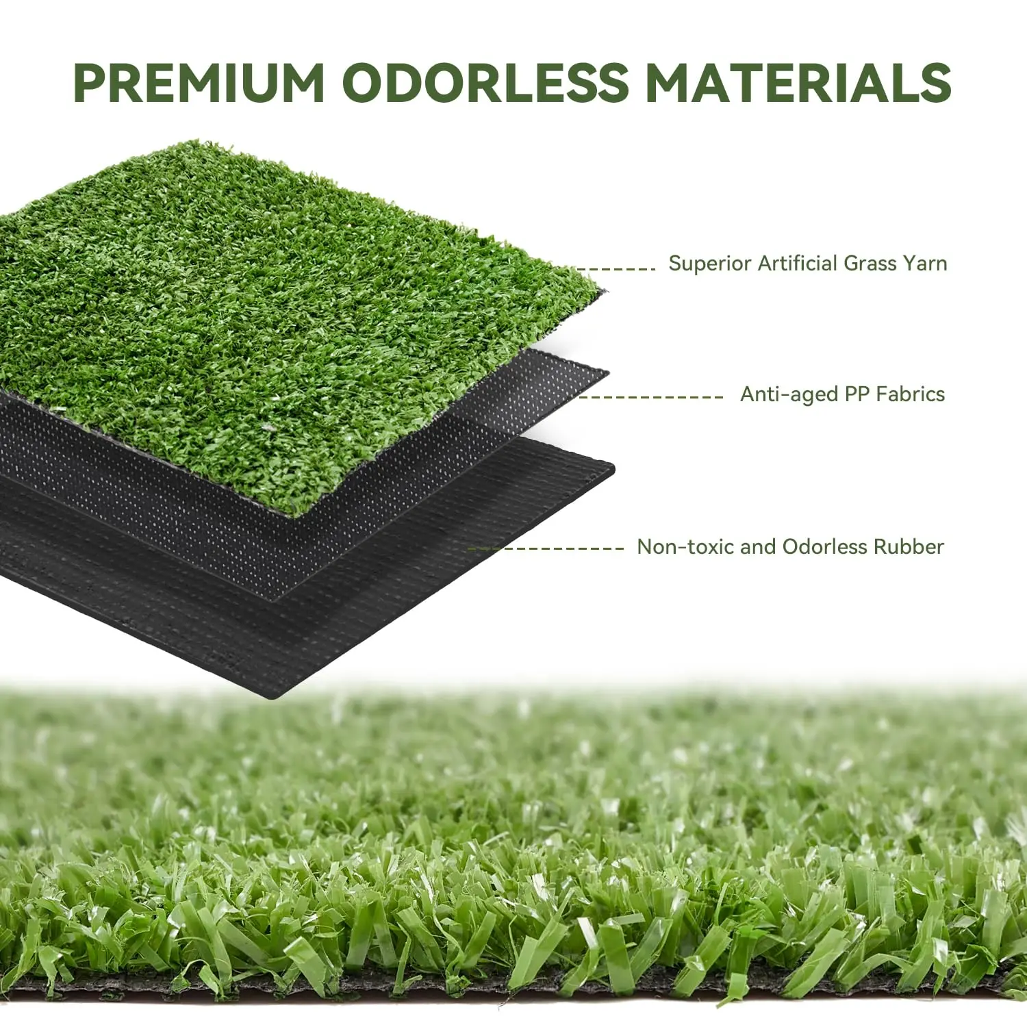 ·【Premium Material】Our artificial turf are made of environment friendly and high quality PP synthetic material,which is wear-resistant,nonslip,and resilience,non-toxic and lead free.The back coating is made of high-grade rubber latex.Eco-friendly,Pet friendly,Child Safe,Comfortable Touch.