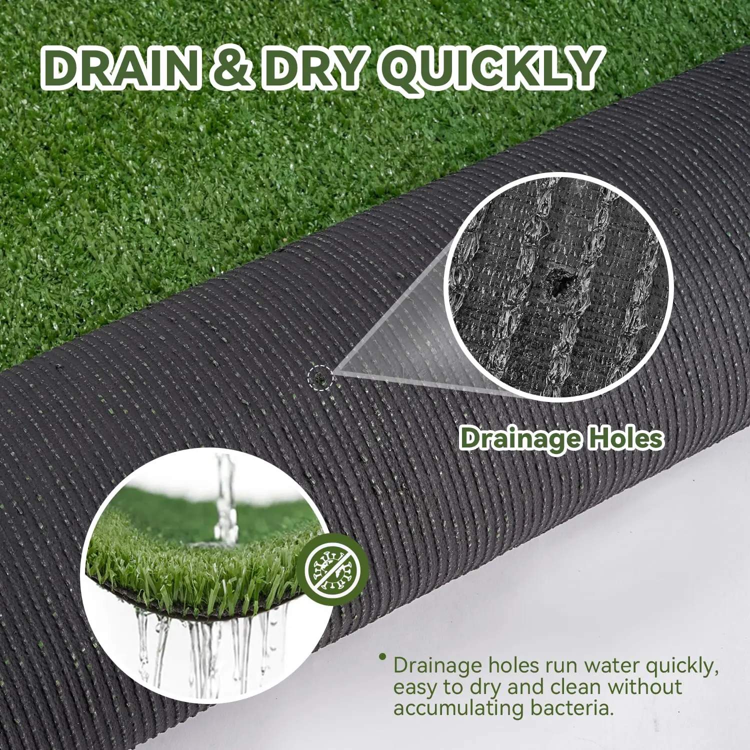 ·【Easy to Install & Clean】You only need to put and roll out the synthetic grass on your yard.The rubber bottom will grab the ground well,including soil,concrete area,wooden floor,etc.Drainage holes design is enable water to percolate into the ground,and helps the artificial turf roll to dry quickly.