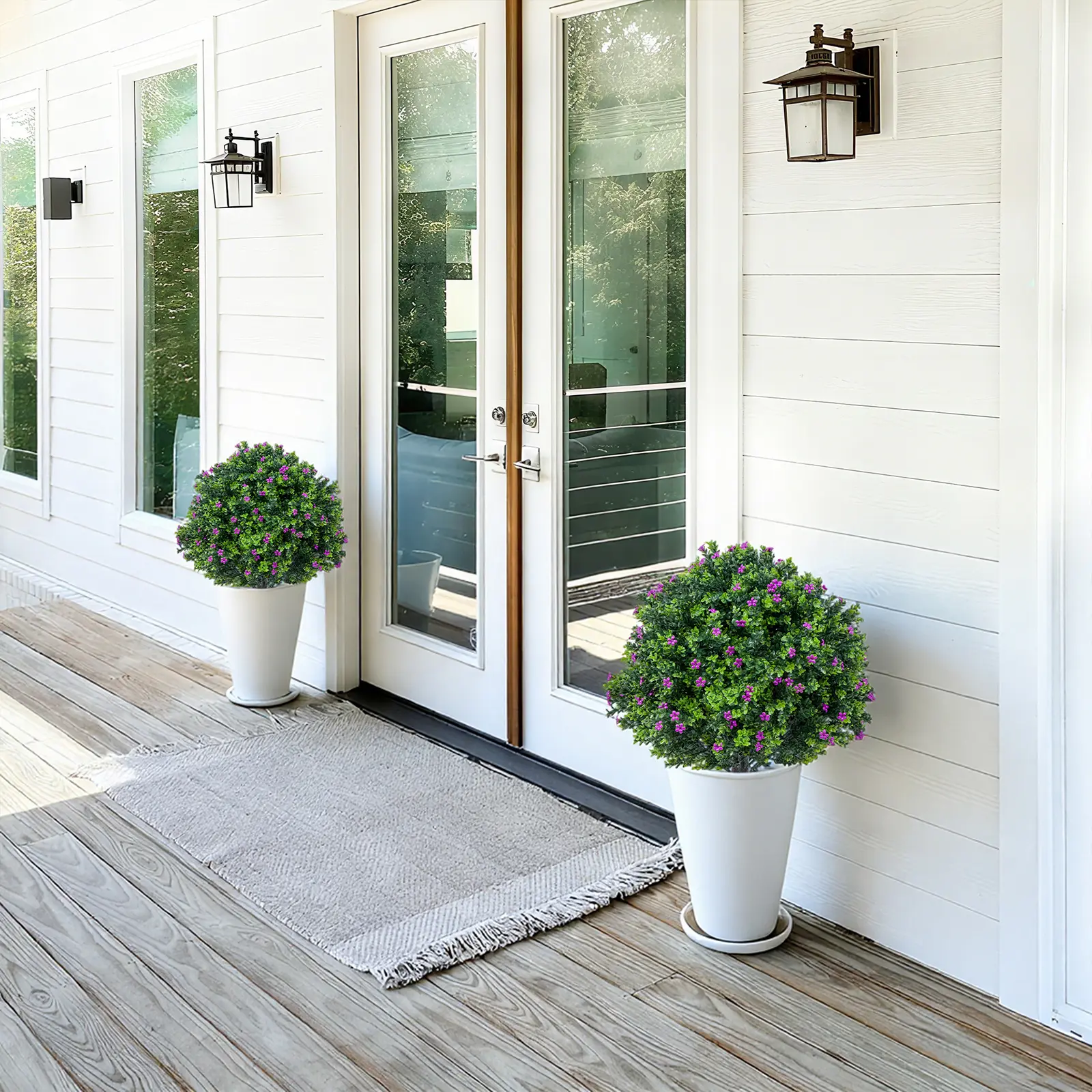 【Multi-level ground floor design】This set of two artificial plants features a multi-level ground floor shape with lush, bright green foliage enhanced by bright purple flowers. It creates a fresh, elegant and carefully maintained aesthetic landscape, perfect as a decorative accent for gardens, patios or living rooms.