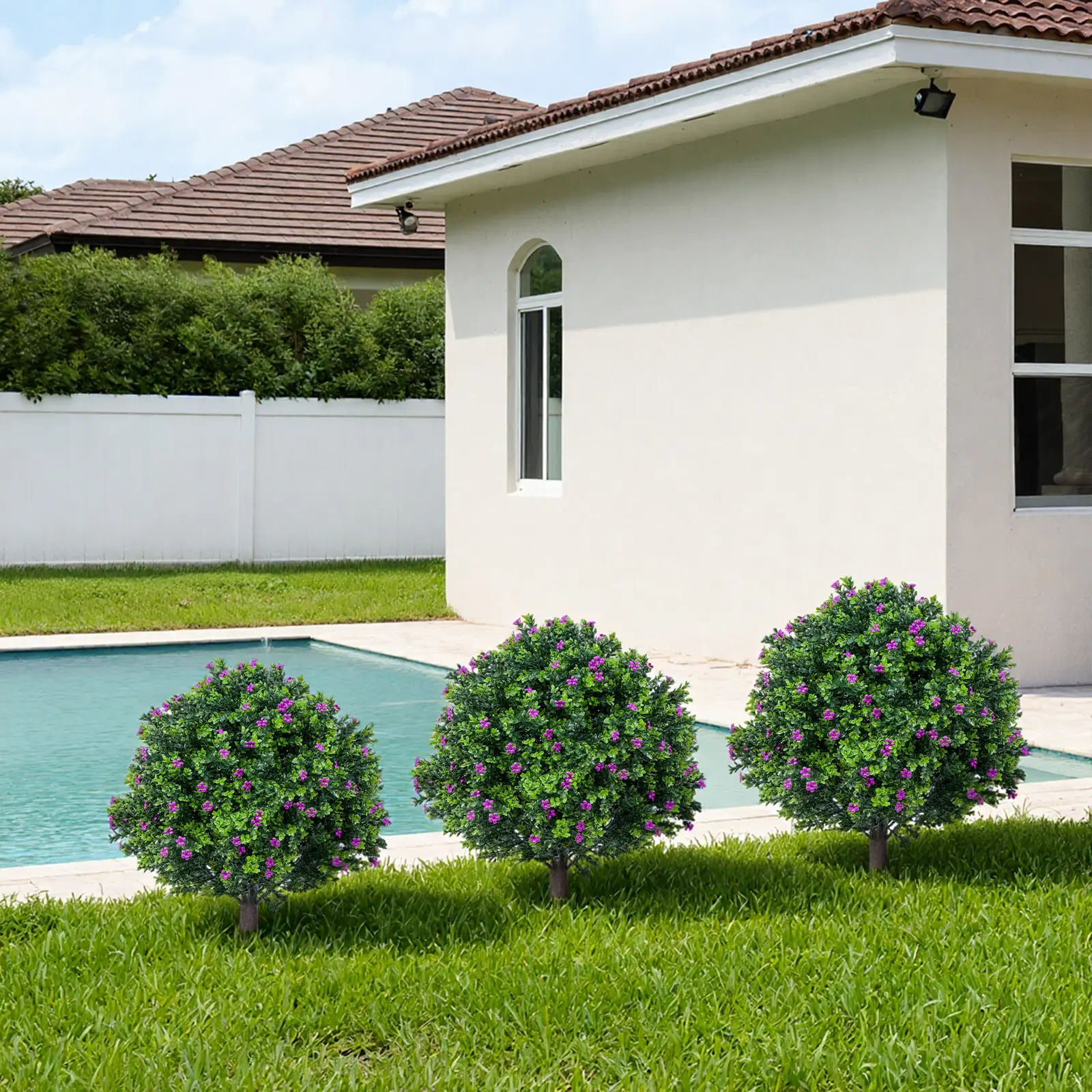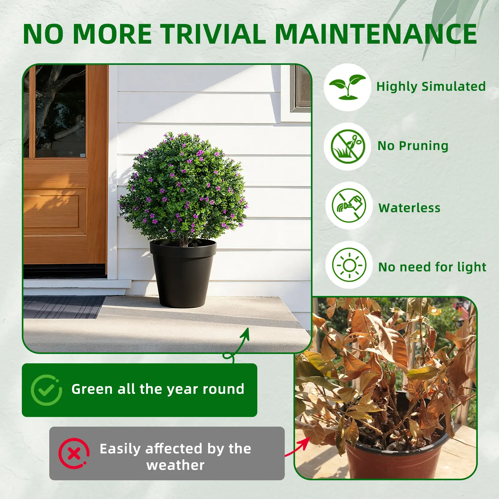 【Robust and durable construction】Made with sturdy plastic branches, iron pickets and PE leaves and flowers, this artificial shrub remains stable even in windy weather. Its discoloration and wear-resistant properties make it suitable for indoor and sheltered outdoor use.
