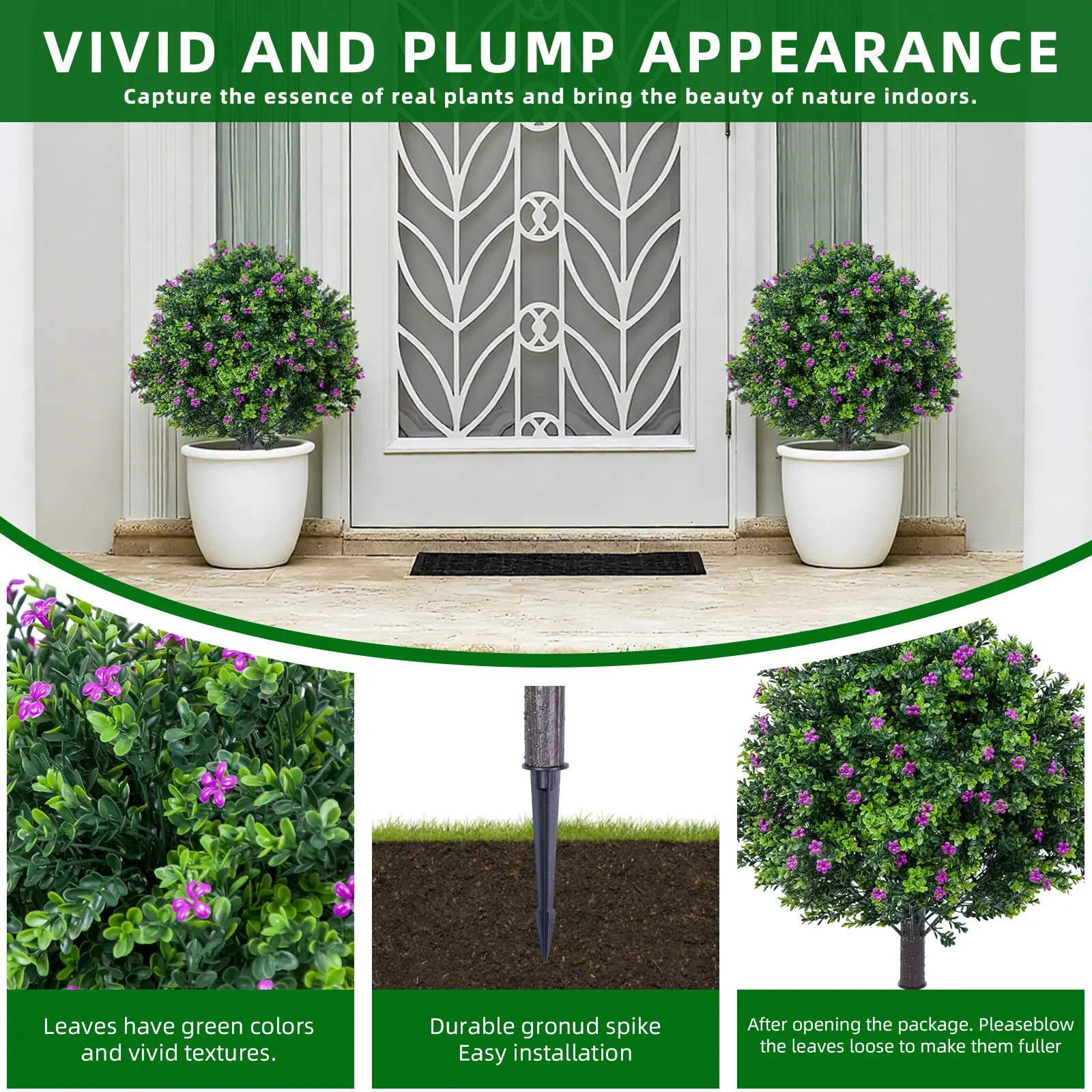 【Easy and flexible installation】 Our artificial shrub pickets are equipped with practical iron pickets that allow them to be quickly anchored in the garden soil, in gardeners or in flower baskets on the balcony, without the need for tools. Take advantage of flexible investment options.