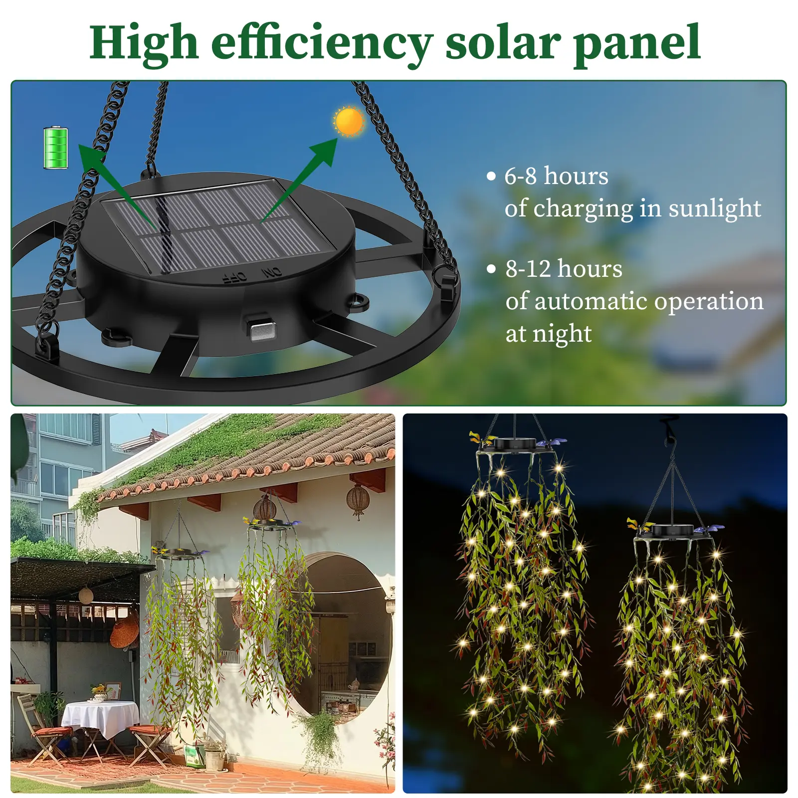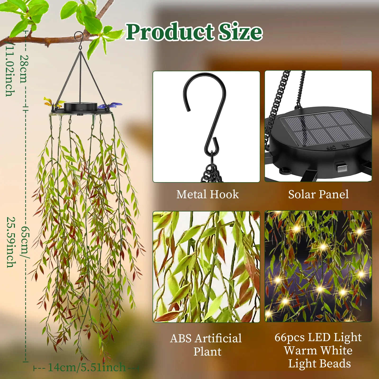 【Natural Aesthetic Design】 Crafted with artfully woven rattan and lifelike bamboo leaves, each strand features cascading foliage that creates enchanting shadow play. Warm white LED lights are discreetly nestled within the vines, casting a dreamy woodland glow at night. Bendable stems allow customizable arrangements to transform any space into a magical garden retreat. 【Versatile Ambiance Creator】 A 2-meter string with 66 high-CRI LED beads emits a soothing 2700K warm glow, perfect for both indoor and outdoor settings. Create cozy nooks on balconies, illuminate patio parties, or enhance café décor—all with zero maintenance. These weather-resistant faux greens stay vibrant year-round without watering or pruning. 【Smart Solar Efficiency】 Upgraded monocrystalline solar panel delivers 23% conversion efficiency. Just 6 hours of sunlight powers 12+ hours of automatic illumination, with dusk-to-dawn auto operation. Energy-saving mode extends performance through 3 cloudy days—eco-friendly and hassle-free. 【All-Weather Resilience】 IP65 waterproof rating with UV-resistant PE vines and sealed LED nodes. Withstands -20°C to 60°C extremes and 8-level winds. The angled solar panel design prevents debris buildup, ensuring reliable charging even in rainy seasons. 【Heartwarming Gift Ready】 Elegantly packaged with included mounting hooks and extension cables. Ideal for Mother’s Day, housewarmings, or garden makeovers—this luminous natural art piece spreads joy effortlessly. Backed by a 2-year warranty for lasting delight.