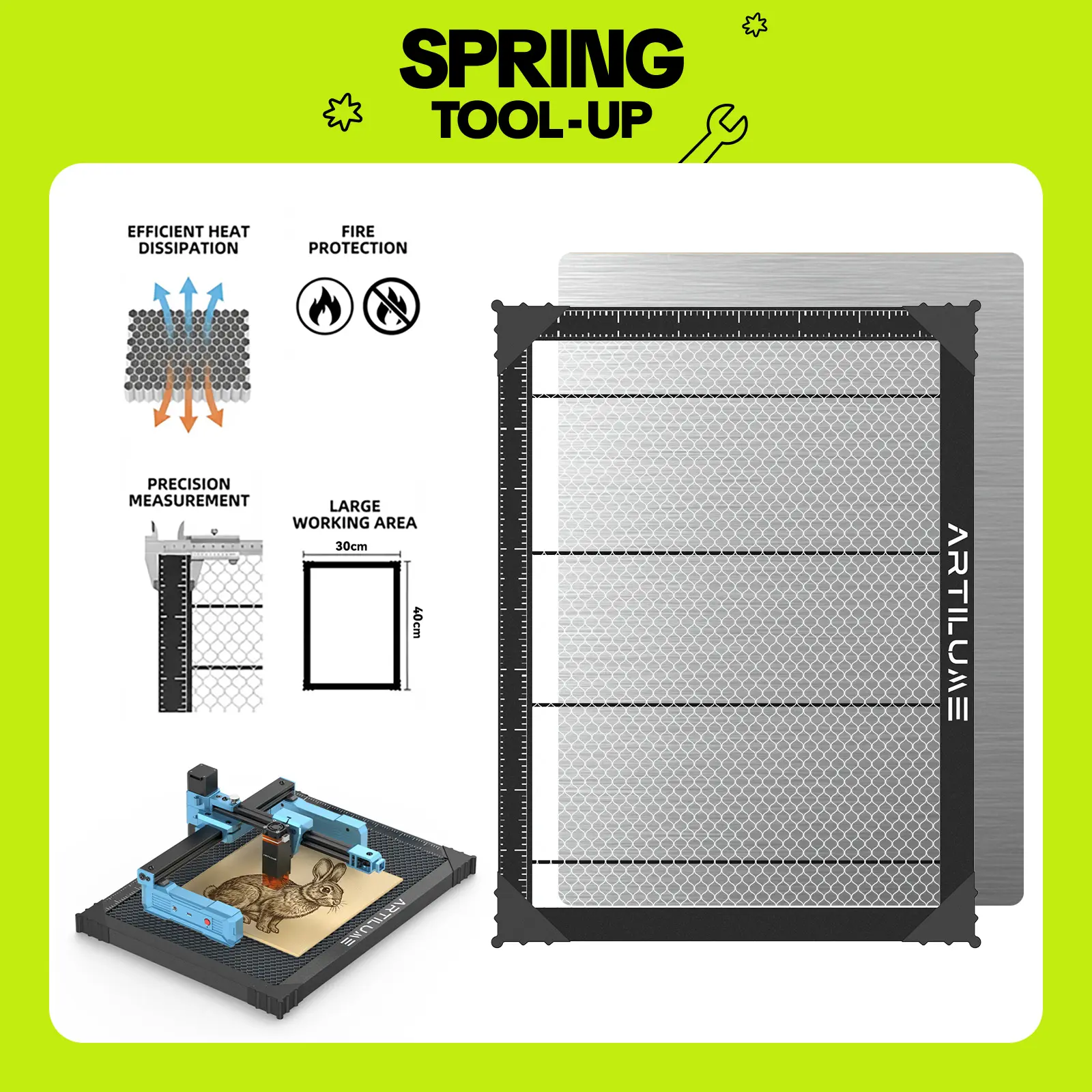 The Honeycomb Laser Bed and aluminum panels provide double protection for your workspace.