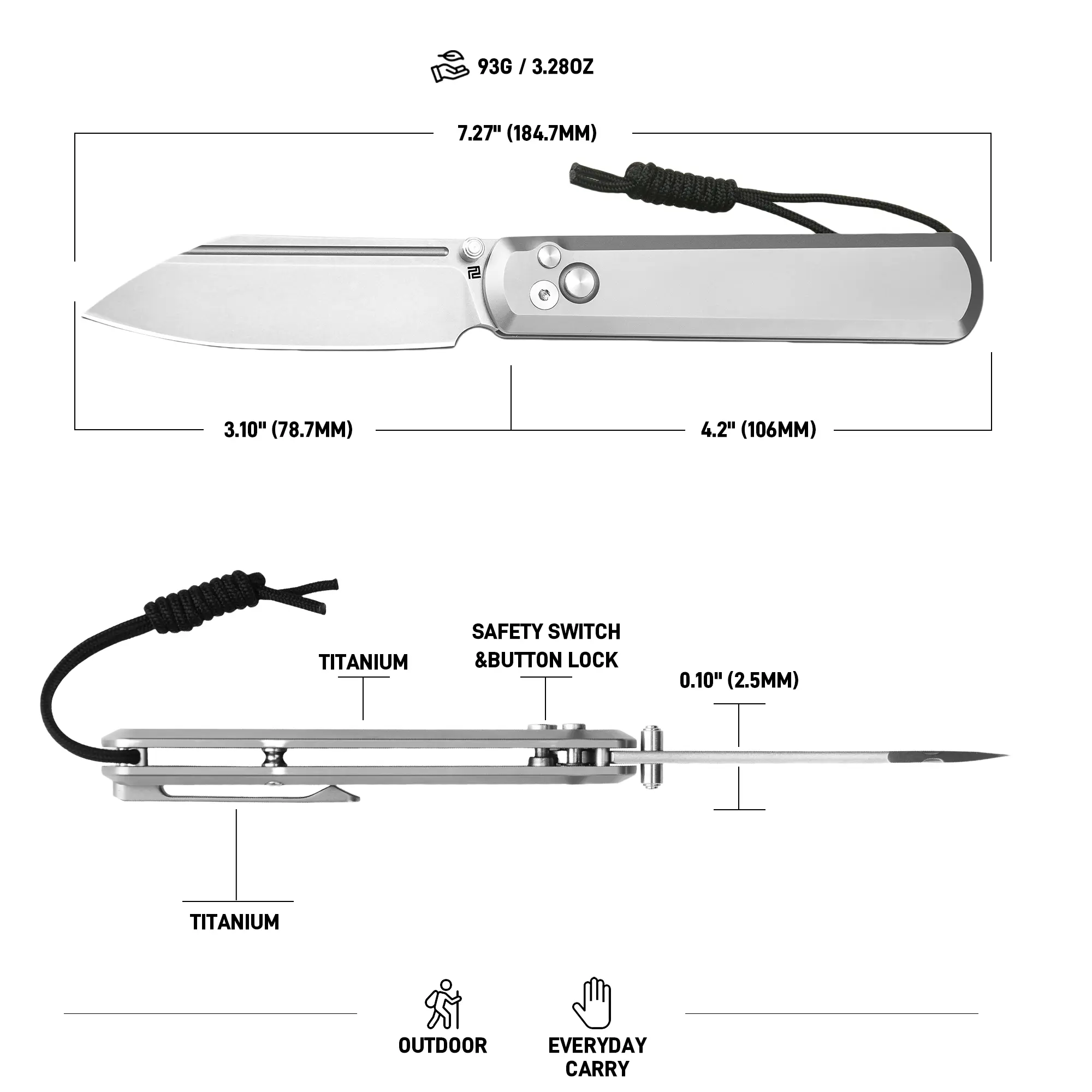 Blade Length: 3.10" (78.7mm) Blade Thickness: 0.10" (2.5mm) Blade Finish: Stone Washed Blade Grind: Flat Blade Material: S90V Blade Hardness: HRC60-62 Blade Style: Wharncliffe Handle Material: Titanium Clip Material: Titanium Pivot Assembly: Ceramic Ball Bearing Lock Type: Button Lock with safety switch Overall Length: 7.27" (184.7mm) Closed Length: 4.2" (106mm) Weight: 93g / 3.28oz