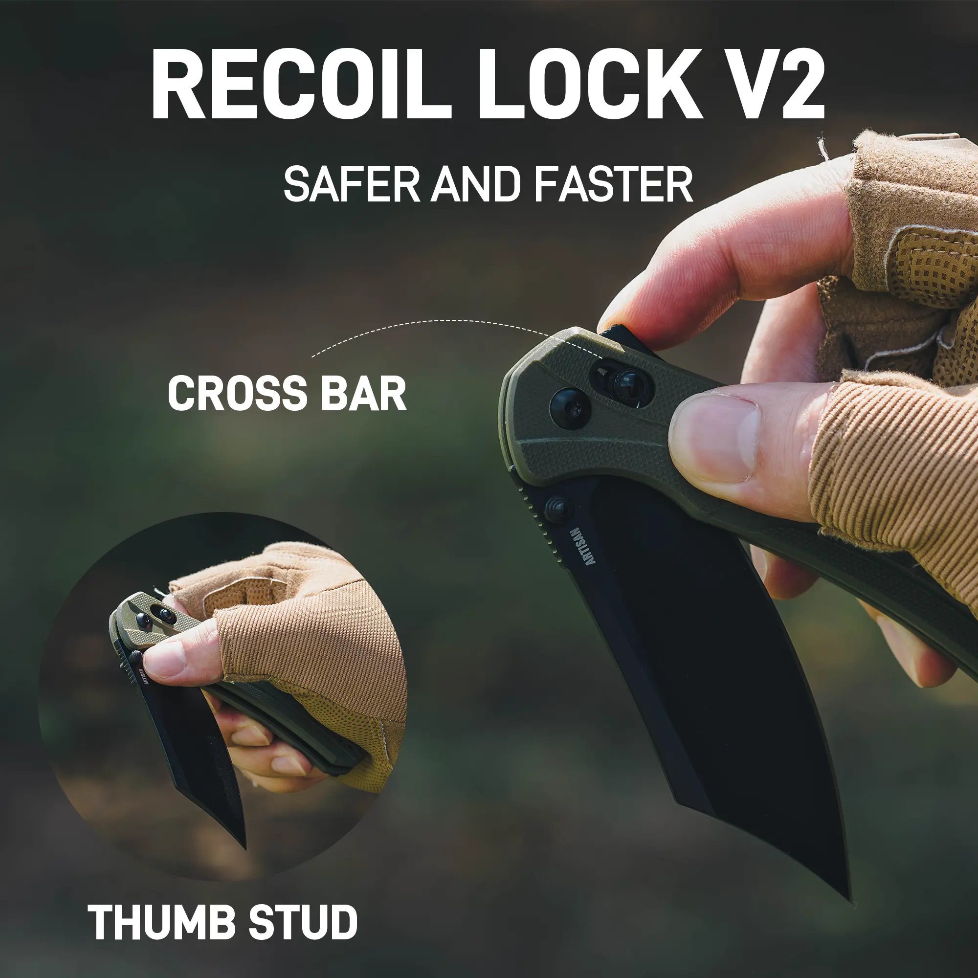 ·Advanced Recoil Lock - Bolt is our first knife to feature the new Recoil Lock V2 design, which combines the strength and durability of crossbar lock. The added external fin allows you to open and close the knife with just one finger.
