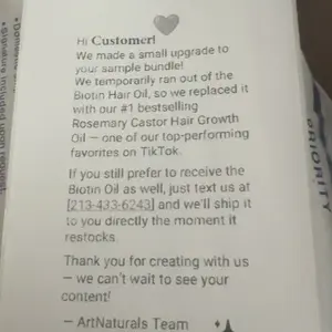 I was expecting to get the biotin oil. It states to text them if I want it when it restocks. Seems like my text isn’t going through. Hopefully it’ll restock and they send me the Biotin oil. If not I’ll get a refund