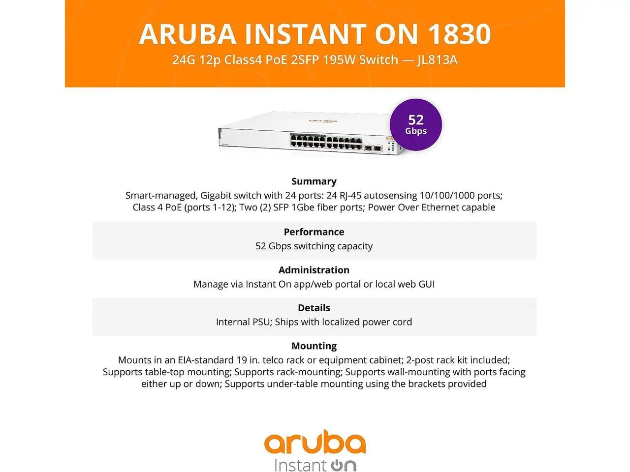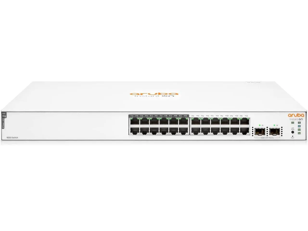 Aruba Instant On 1830 24-Port Gb | 12-Port Class 4 PoE Smart Switch (195W) - 24x 1G | 2X SFP | US Cord (JL813A#ABA)
