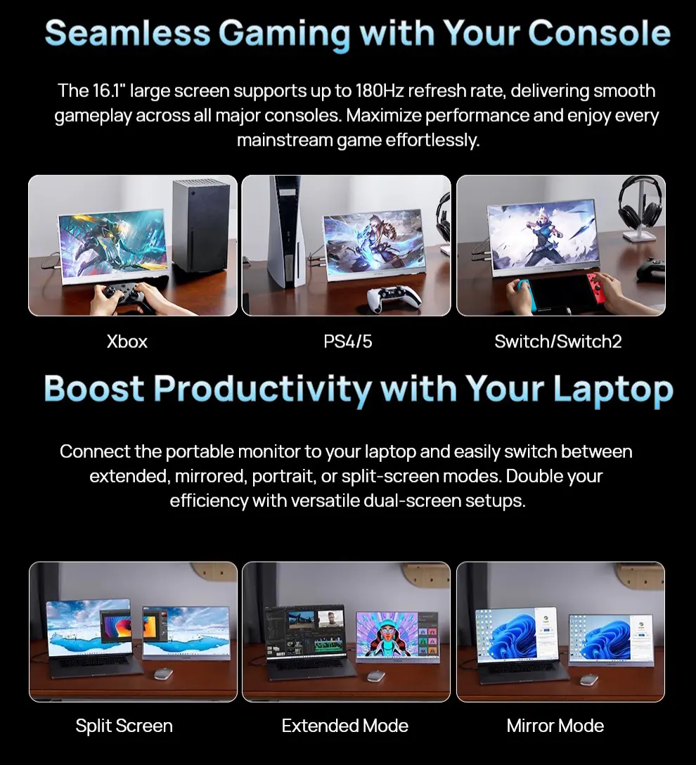 Excelente monitor portátil. La imagen se ve súper clara en 2.5K, corre muy fluido con los 180Hz y es perfecto para conectar al teléfono o la laptop. Ligero, práctico y de muy buena calidad. ¡Me encantó!