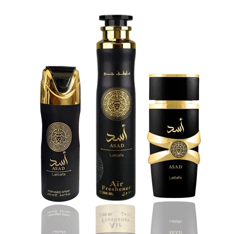 Step into a bold, confident aura with this complete Asad fragrance bundle. Featuring the iconic Eau de Parfum, matching deodorant, and air freshener, this set brings power and sophistication to both you and your space.