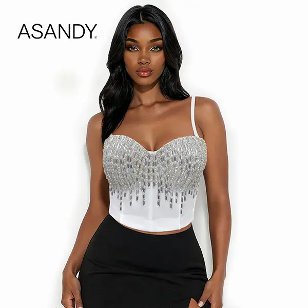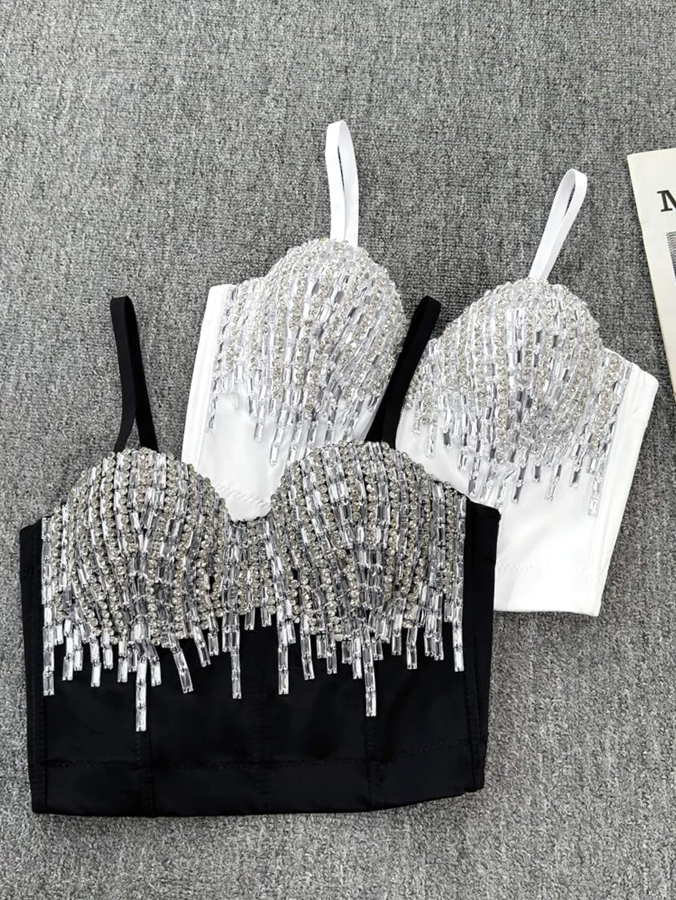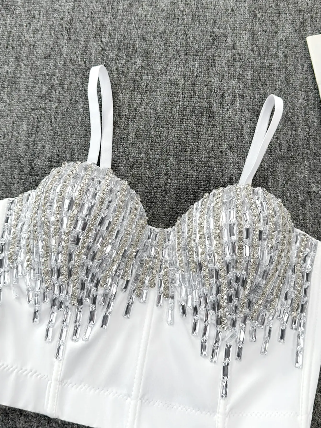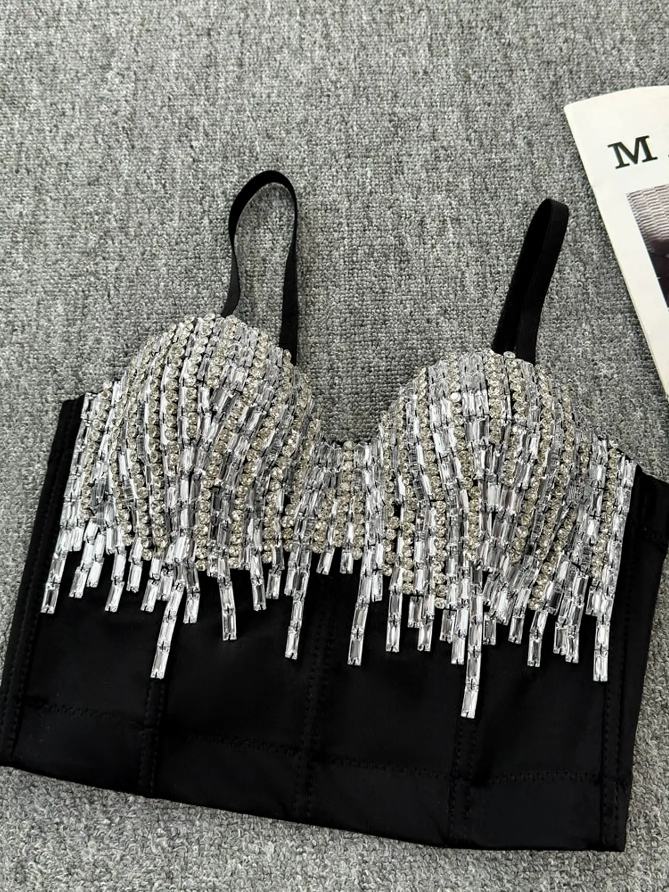 ASANDY Women’s Rhinestone Fringe Bustier Crop Top, Sweetheart Neck Spaghetti Strap Beaded Party Top for Club Nights & Date Nights
