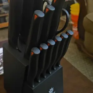 ¡KNIFE SET WITH BLOCK: Meet all your kitchen needs! This set includes 8" chef's knife, 8" bread knife, 8" slicing knife, 7" santoku knife, 5" utility knife, 3.5" paring knife, 6 pcs 4.5" serrated steak knives, kitchen shears, and hardwood knife block with built-in knife sharpener. Perfect for budding chefs!