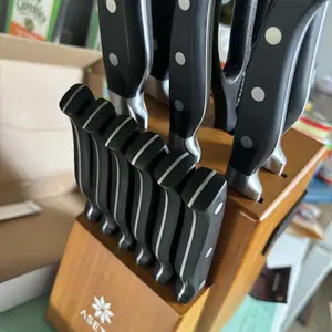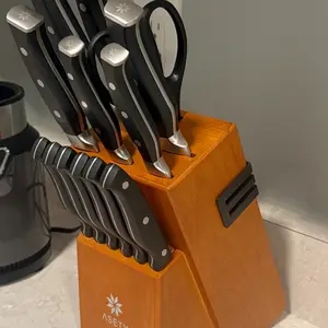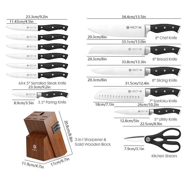 ·COMPLETE,VALUE SET : Set includes 8" chef's knife, 8" bread knife, 8" slicing knife, 7" santoku knife, 5" utility knife, 3.5" paring knife, 6 pcs 4.5" serrated steak knives, kitchen shears, and wooden knife holder with two-stage knife sharpener. The knife sharpener in the block will keep all your knives in their optimal condition at all times.