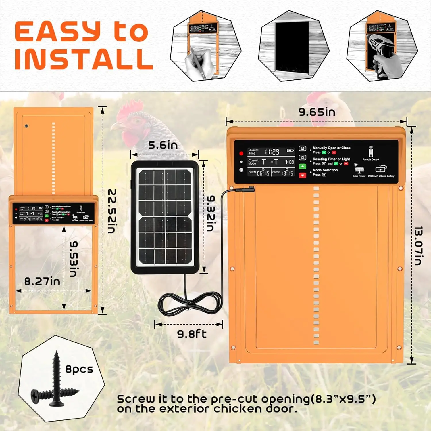 🔩【Easy to Install and Program】Upgraded your chicken game with solar automatic chicken door, the installation is simple and straightforward, ensuring the solar panel is placed where it can receive more sunlight. it's genuinely convenient to use and electric chicken coop door is solar powered, so no need complicated wiring or cabling. Stress-free chicken care even on vacay! Hassle-free setup and major time-saver Makes it an essential accessory for any poultry owner.