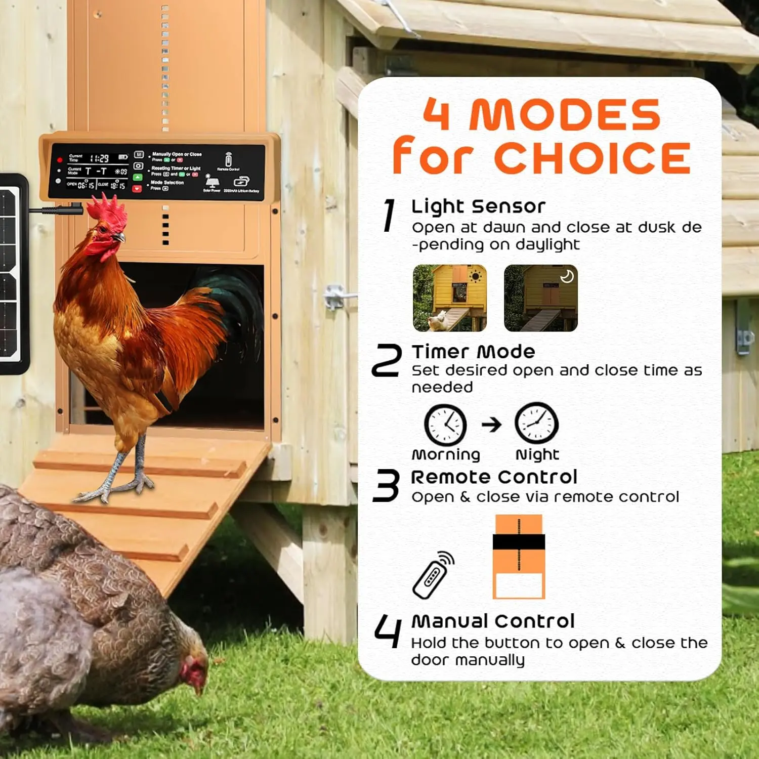 ⏰【Timer & Natural Light Sensing Auto Chicken Door】This Solar chicken coop door has 4 Easy modes – timer, light sensor, remote control or manual mode. Has timer function. You can set the specific opening and closing time, so that the chickens can enter and exit the chicken house within a fixed time. It also uses a light-sensitive sensor to automatically open and close the door based on light intensity. This makes coop management easier and save time and effort while ensuring the safety and comfort of chickens. This auto chicken coop door has significantly eased your responsibilities as a chicken farmer.