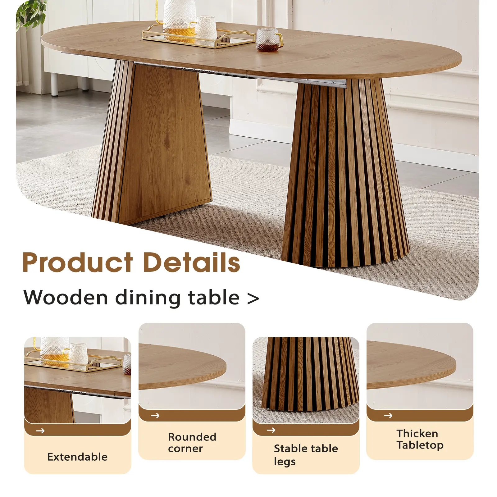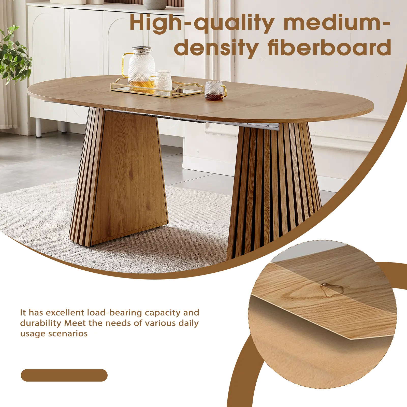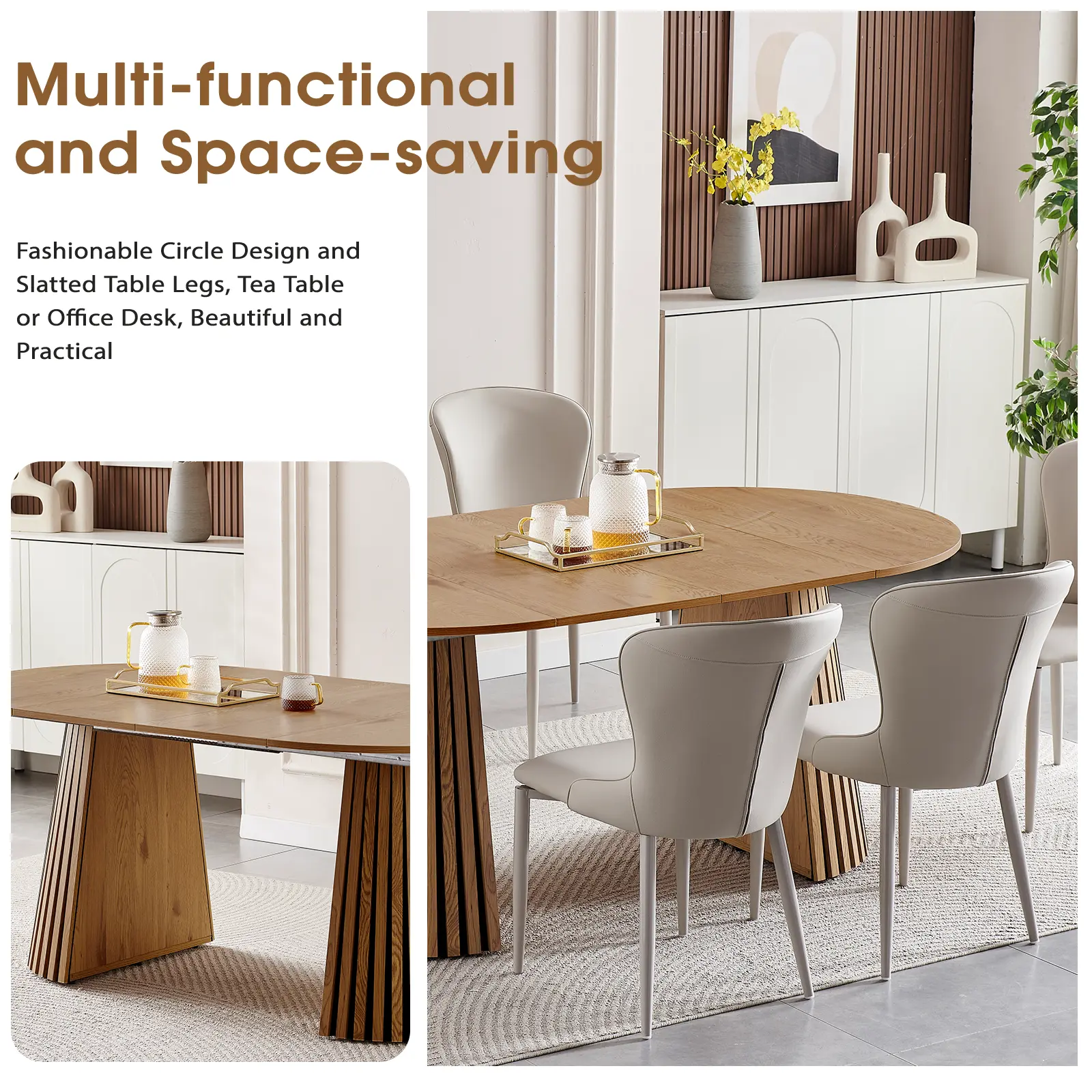 2. Stylish & Modern Oval Shapes Featuring a sleek oval tabletop with smooth rounded edges and contemporary slatted legs, this table blends modern farmhouse charm with practical safety. Its natural wood finish fits effortlessly into any home decor.