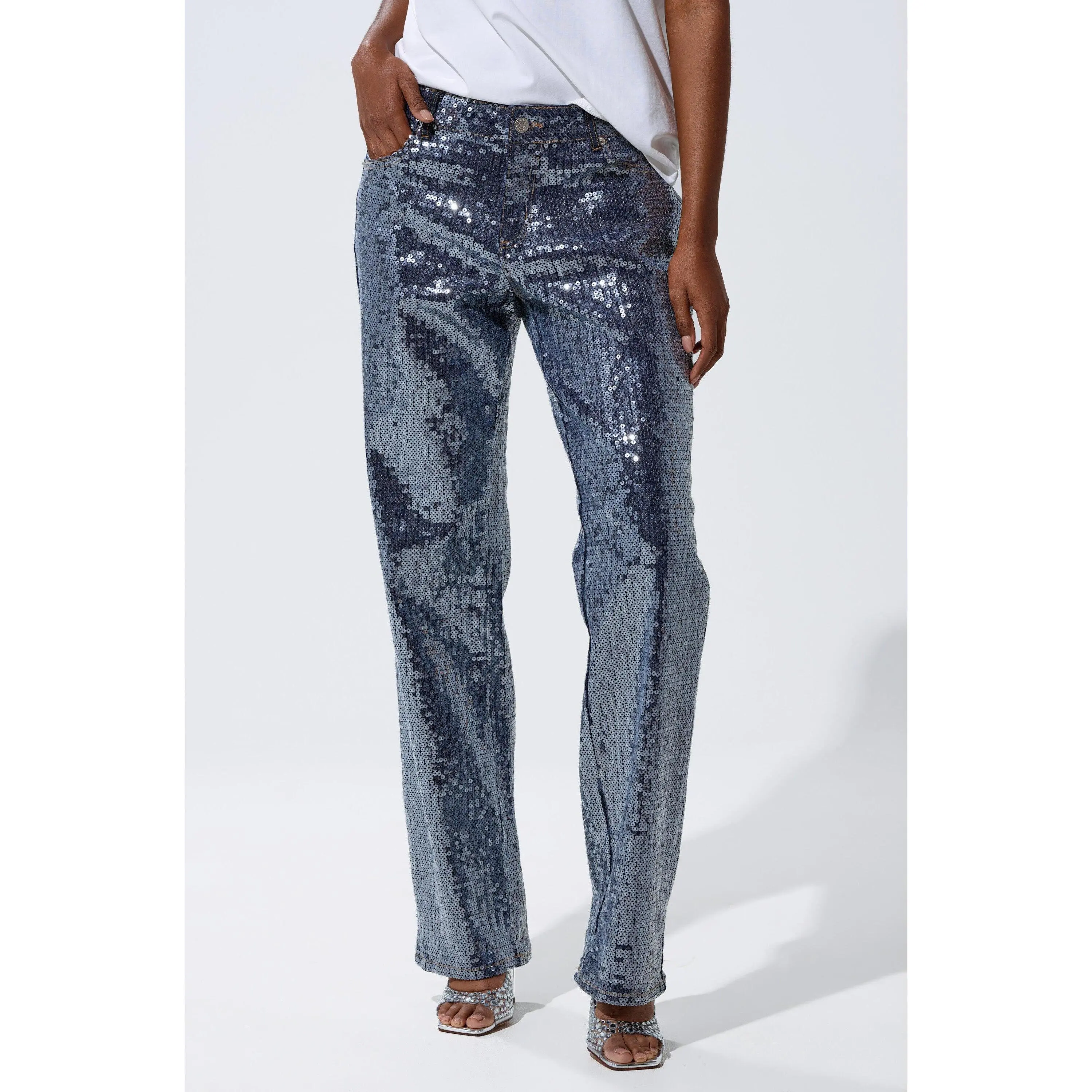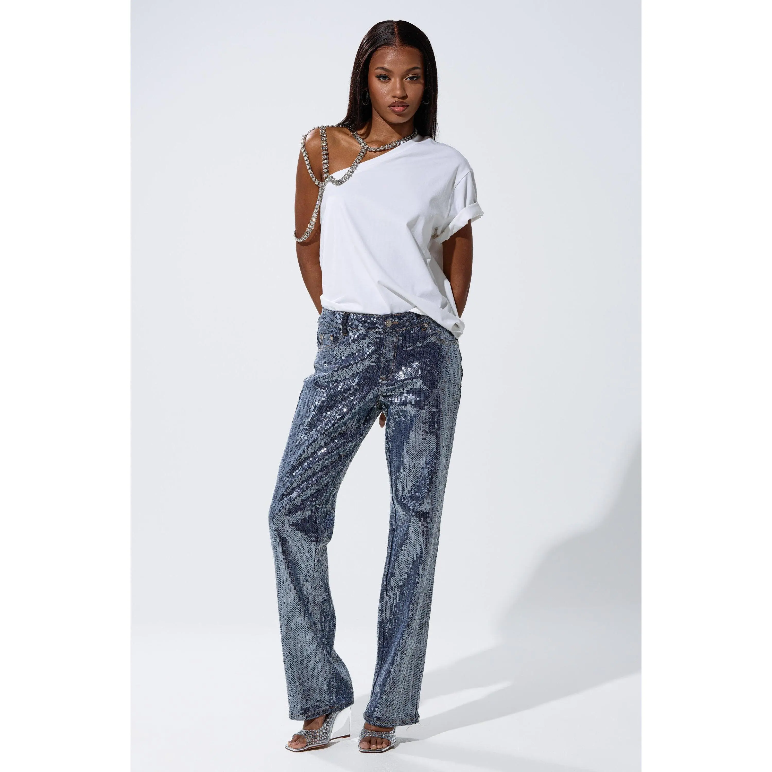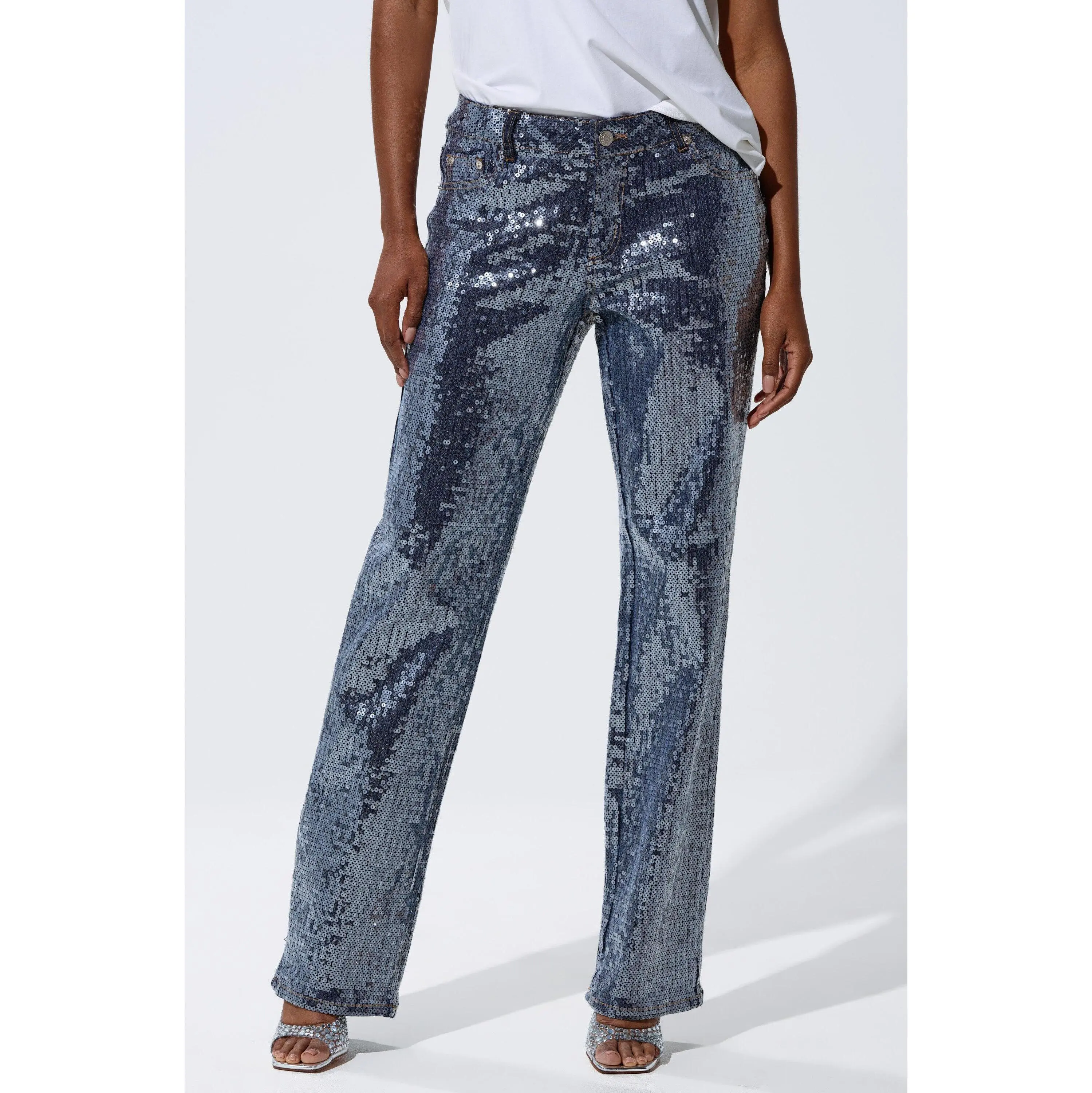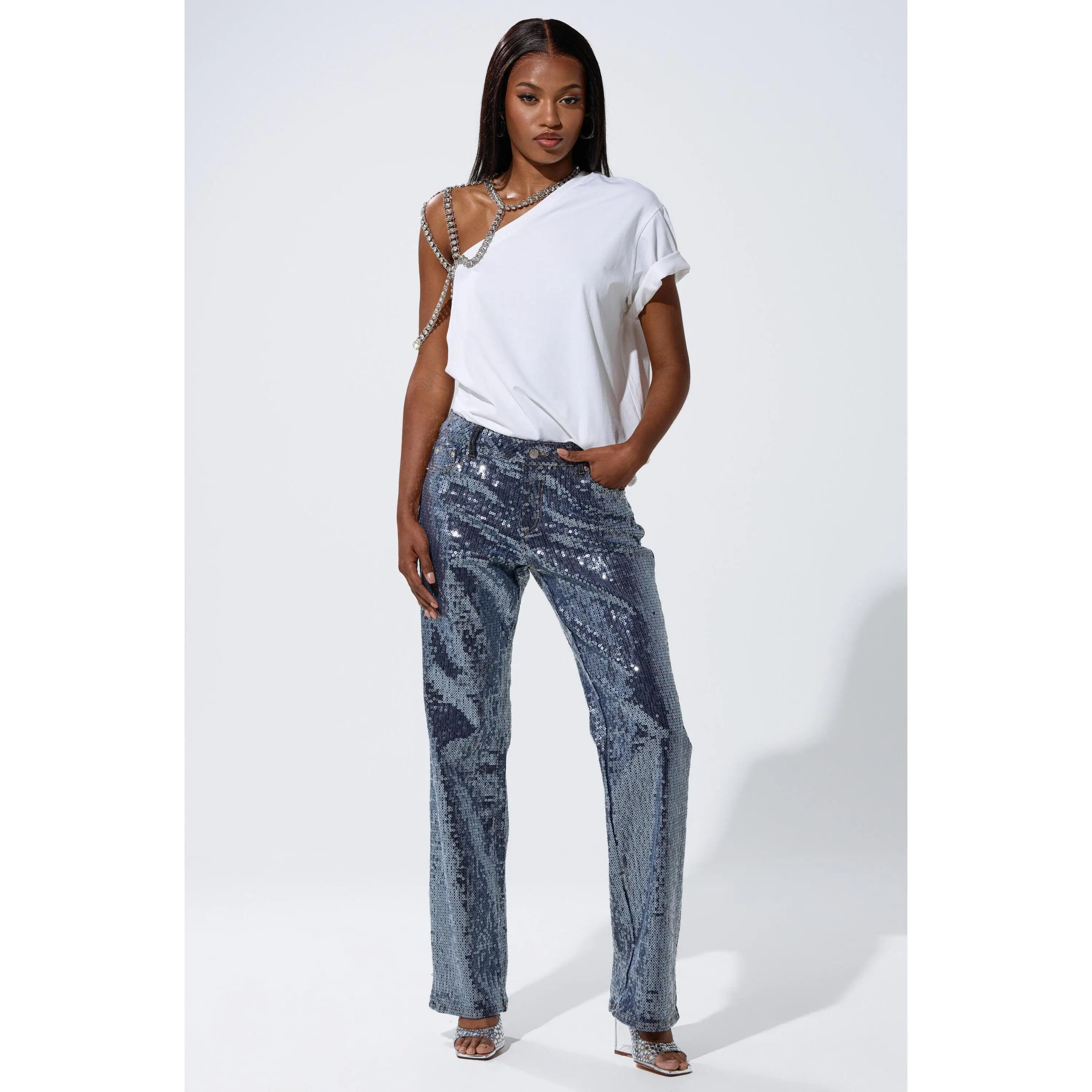 Denim has never been so dazzling. The AKIRA Label Ashton Sequin Denim Pant is crafted from soft, stretchy indigo denim adorned with innumerable translucent sequins throughout. They feature a high-rise, relaxed fit, functional belt loops, a classic five-pocket design, and a zip-button front closure.- 75% Cotton, 22% Polyester, 3% Spandex- Hand Wash Cold- Some Stretch- Imported(all measurements approximate from size small)- 10” Rise- 32” Inseam- Model is 5’9” and wearing a size smallProduct ID: 1060806(all measurements approximate from size 1X)- 12” Rise- 32.5” InseamProduct ID: 1060810