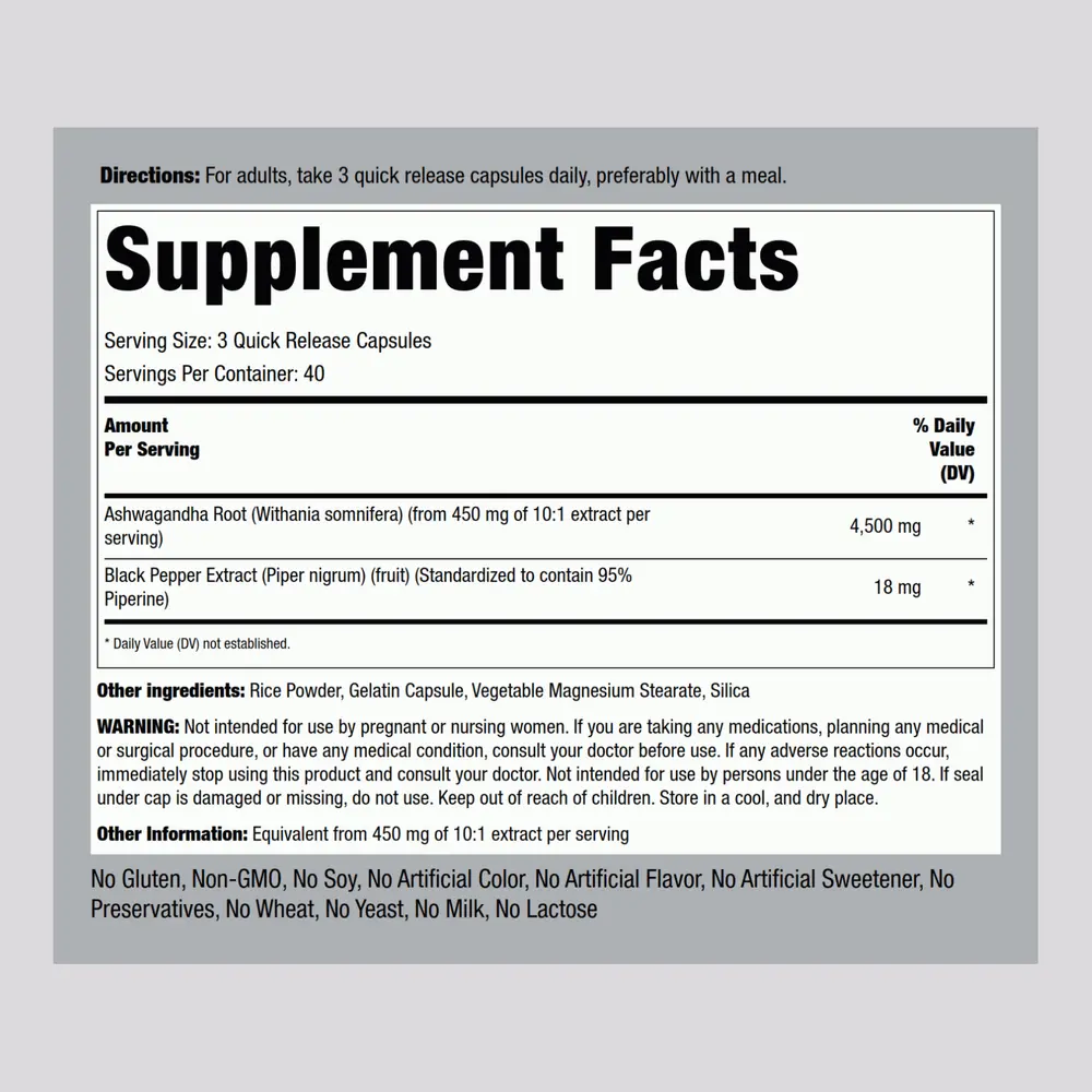 Now get a powerful supply of this traditional herb with Piping Rock Ashwagandha supplements. Our quick-release capsules are scientifically crafted, supplying the equivalent of 4,500 mg of Ashwagandha plus Black Pepper Extract for optimal absorption. Our supplement is gluten-free and made without preservatives, an excellent source of daily nutritional support!