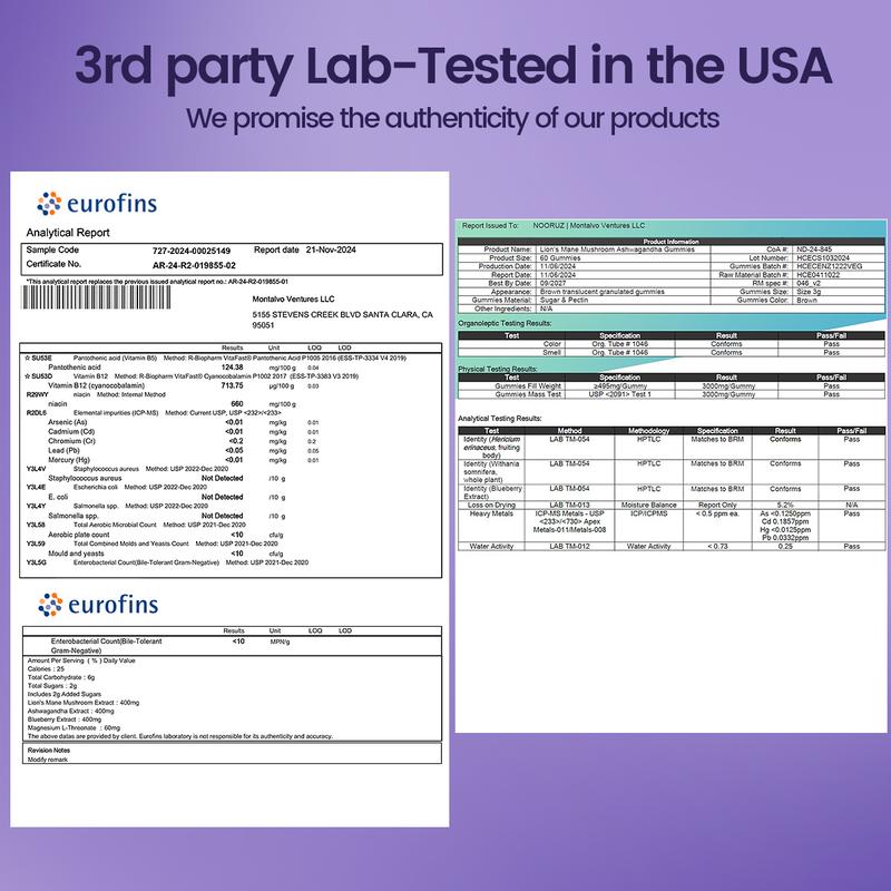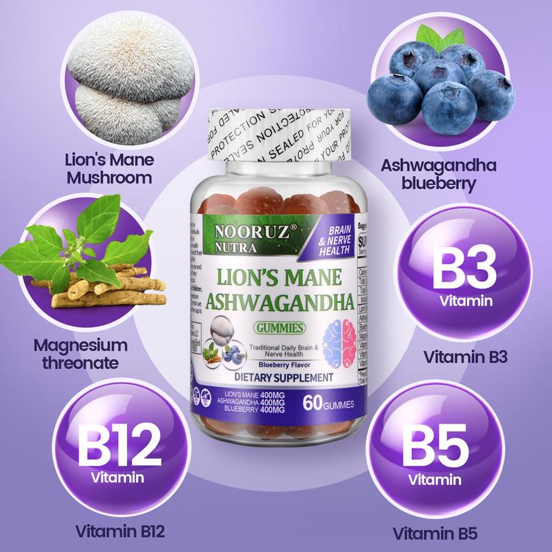 NOORUZ 4-in-1 Brain Anti-Aging Gummies - Supports memory and brain cell function, improves brain fog and forgetfulness - Contains Lion's Mane, Ashwagandha, and Magnesium, suitable for men and women Fitness Mushroom Complex