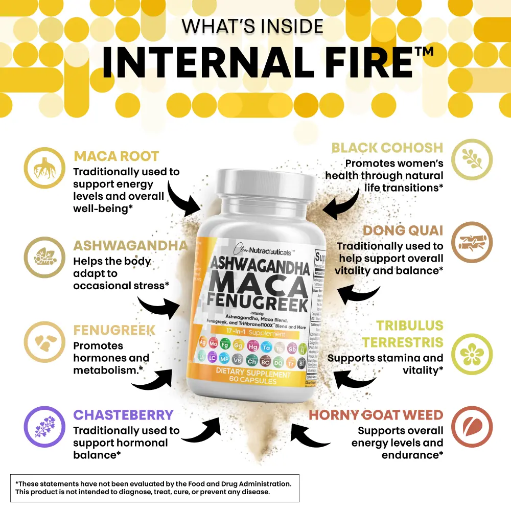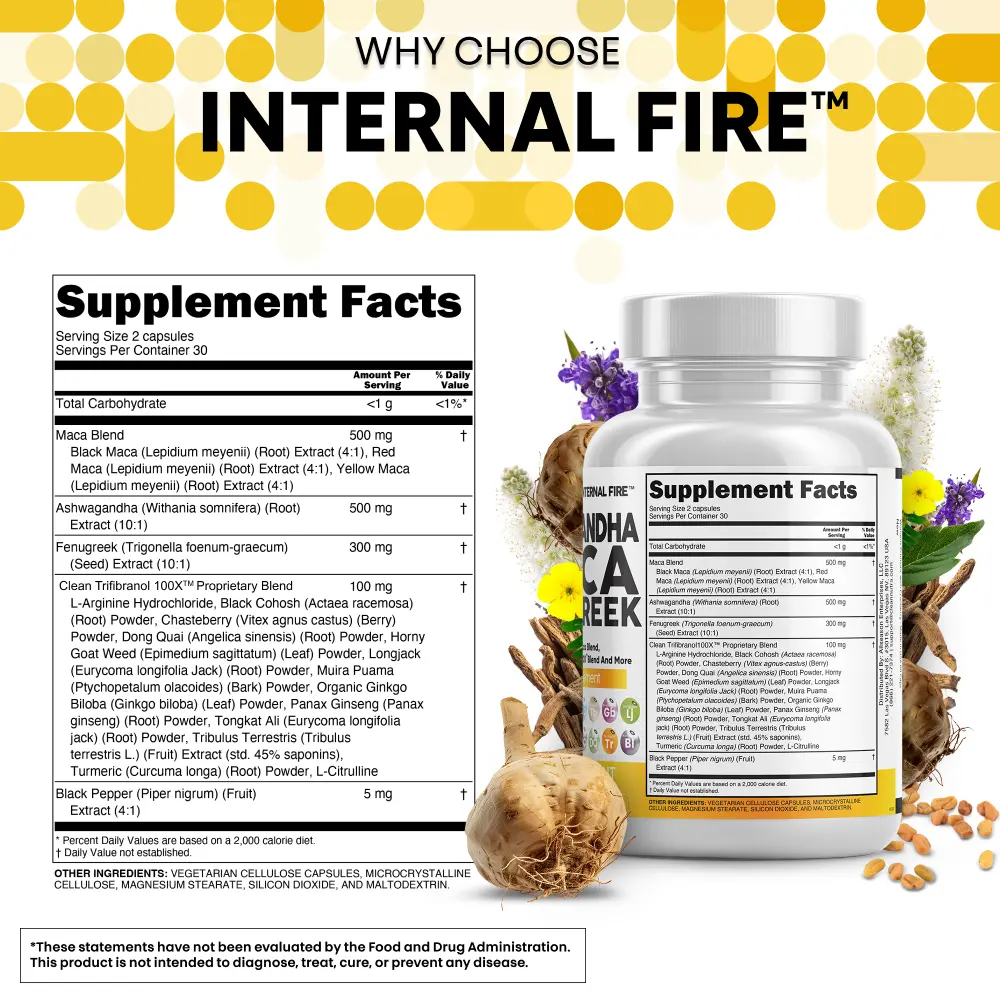 ·Introducing the Trifibranol100X Blend - Don’t settle for products that only contain MACA root or Ashwagandha root. Our signature Internal Fire blend contains these essential ingredients plus turmeric, ginkgo biloba, panax ginseng, dong quai, muira puama, black cohosh, tongkat ali extract, tribulus, long jack, l-arginine, l citrulline, and chasteberry.