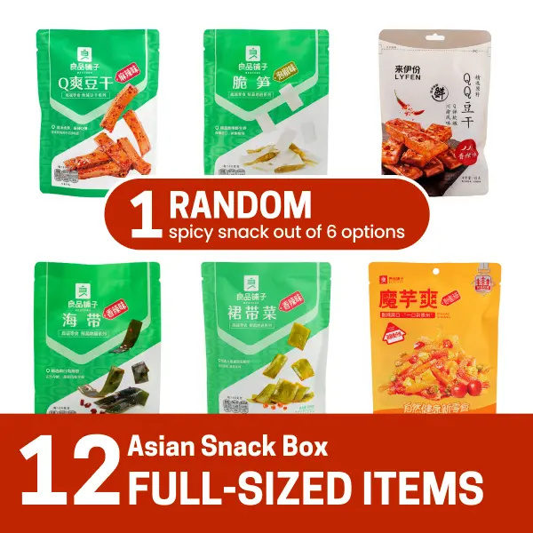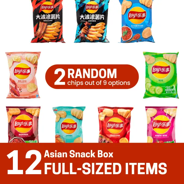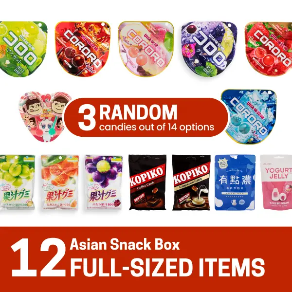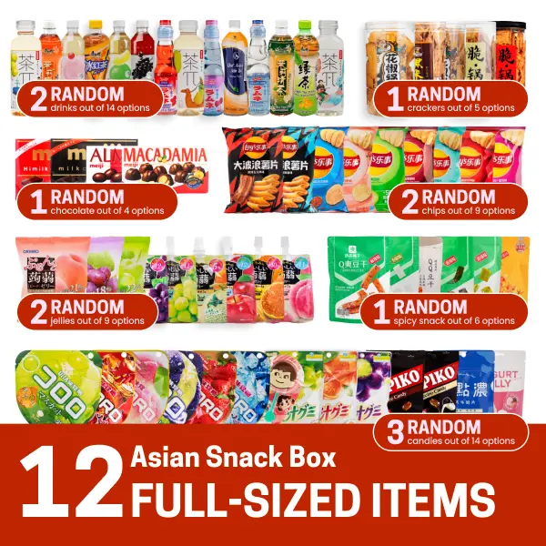 Unbox 12 full-sized Japanese and Chinese snacks and drinks â each handpicked from the most popular treats loved across the world! From sweet to spicy, crunchy to chewy, this mystery snack box is packed with surprises in every bite.
