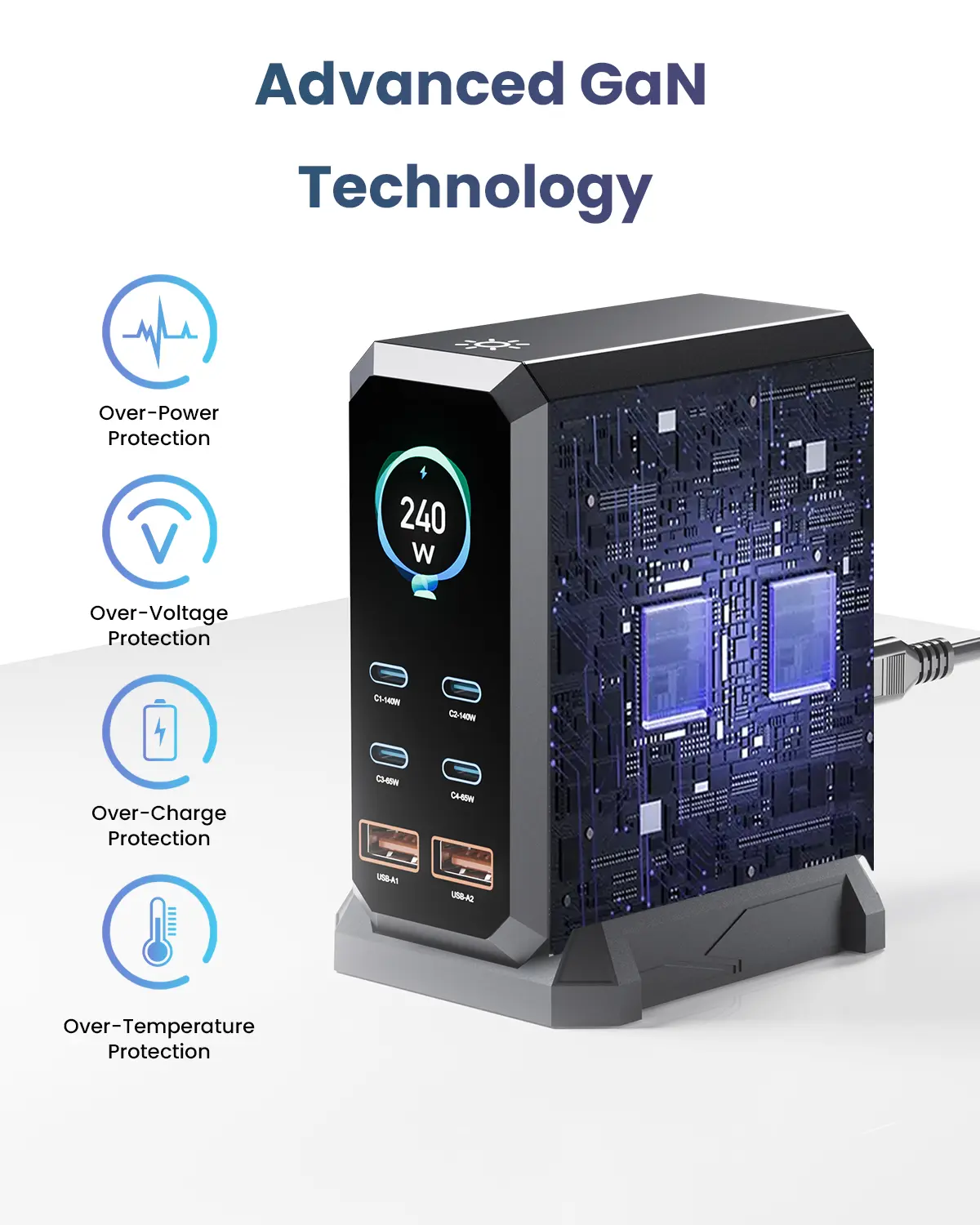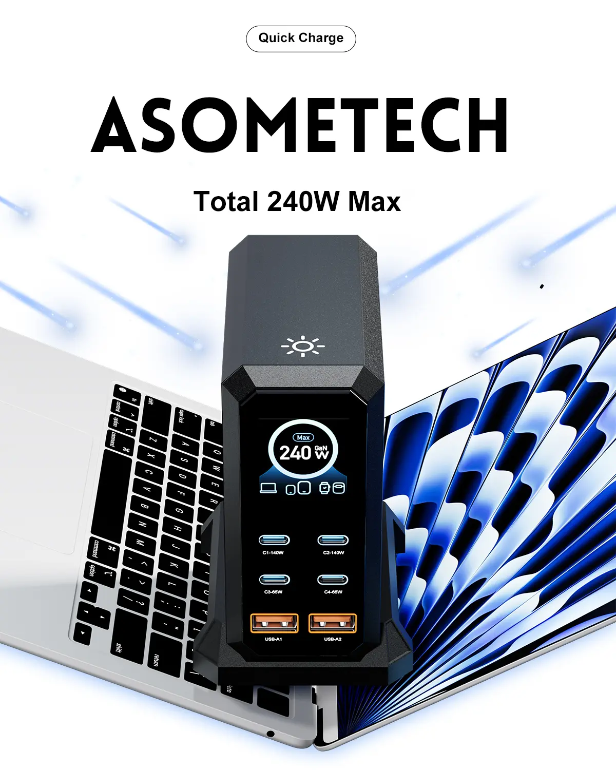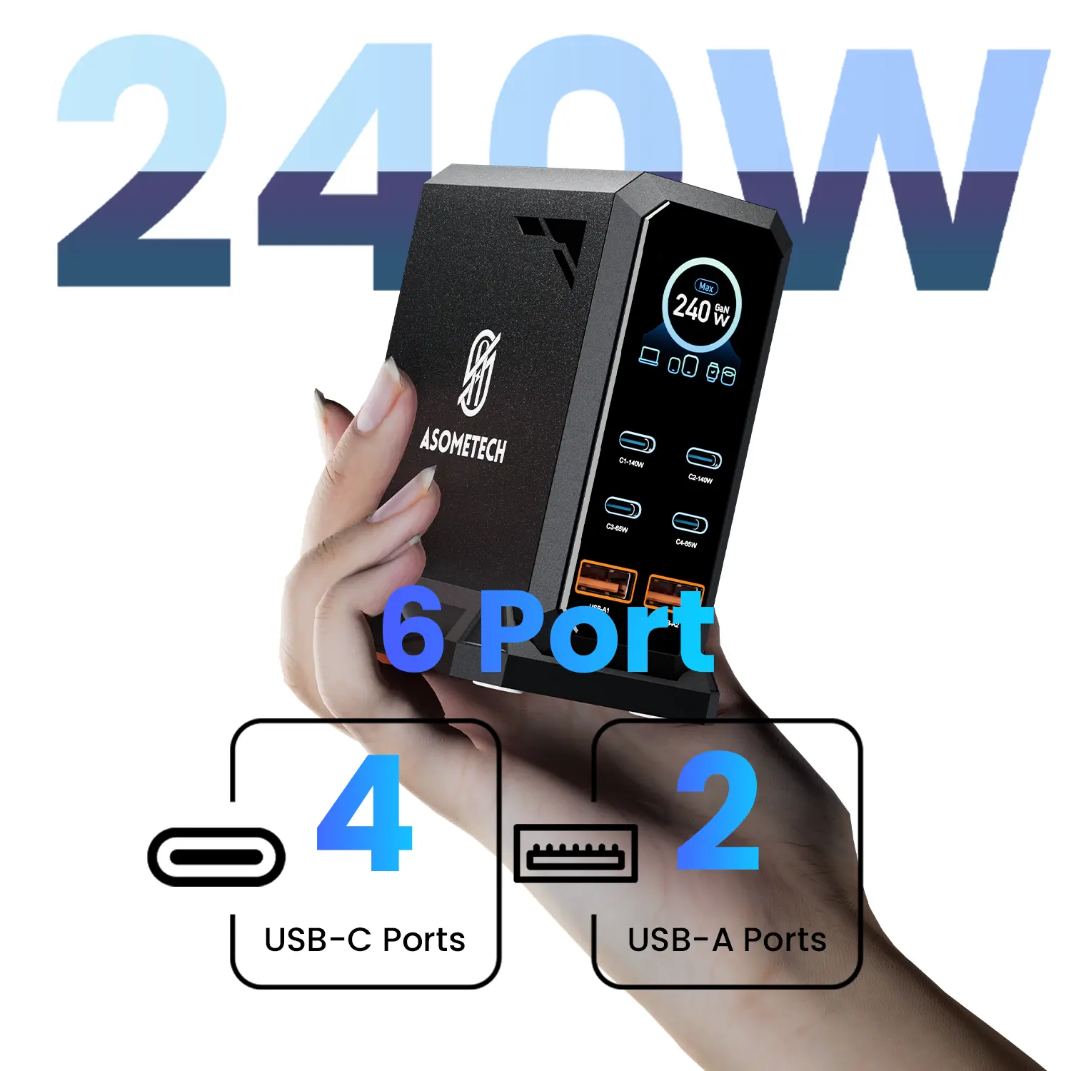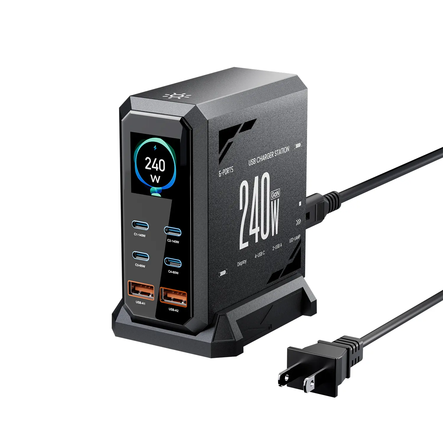 ·6 IN 1 240W USB C Charger :This charging blocks with 4 x USB C PD 3.0 port and 2 x USB port.supports a maximum output of 240 watt in total. The C1/C2 port support up to 140W PD3.1 fast charging.Can fast Charging your laptop,tablet,watch, earphone, mobile phone at the same time.no need to wait.
