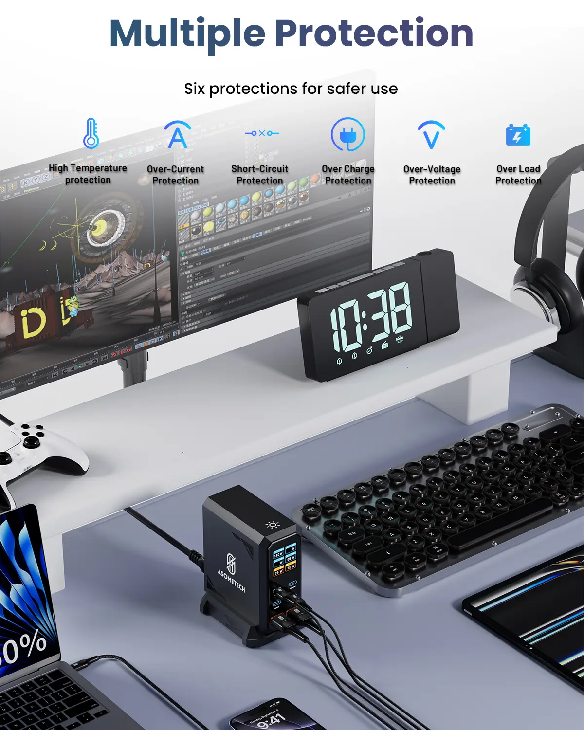 ·Compact Desktop Charging Station: Tired of messy cables and slow charging speeds? This 6-ports charging station is the perfect solution to keep your desktop neat and organized. Powerful, efficient and compact, it's designed for eliminating clutter while ensuring fast, reliable charging.Suitable for home,office,travel.FAQ: