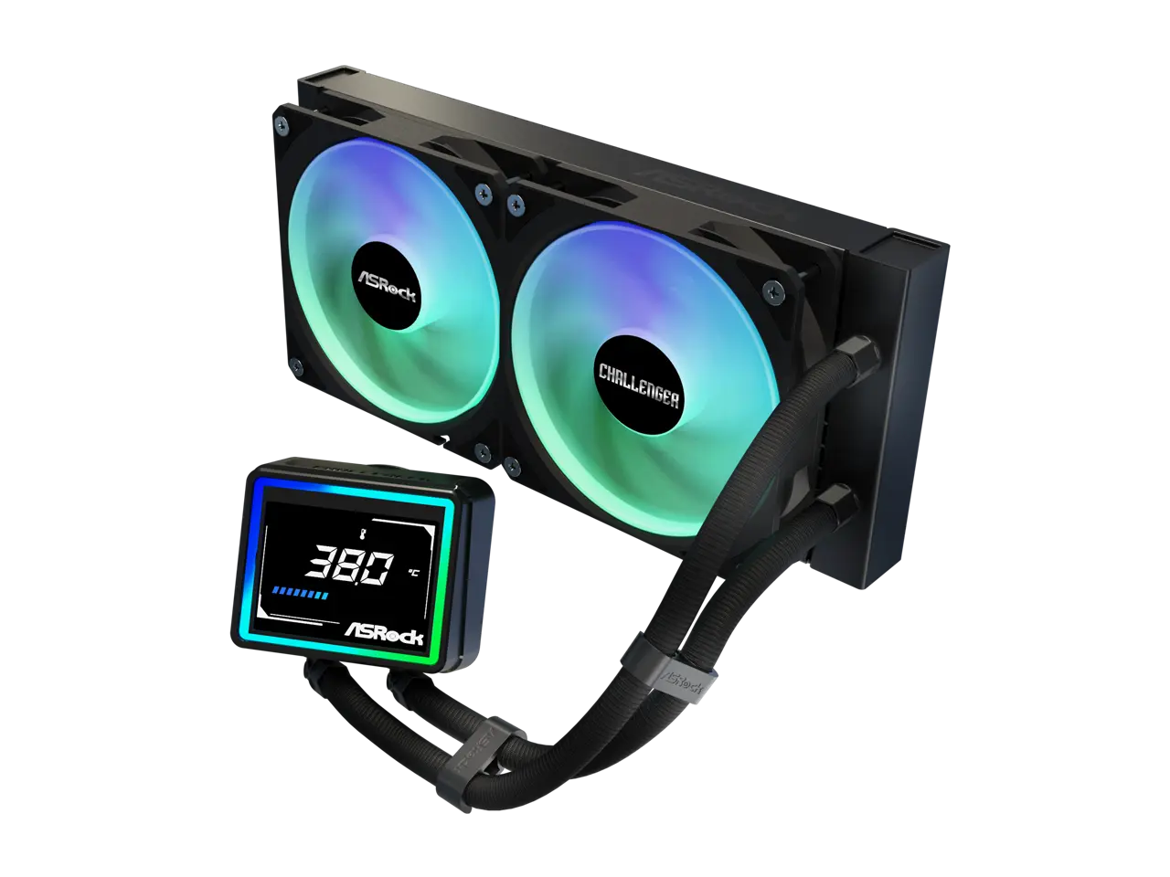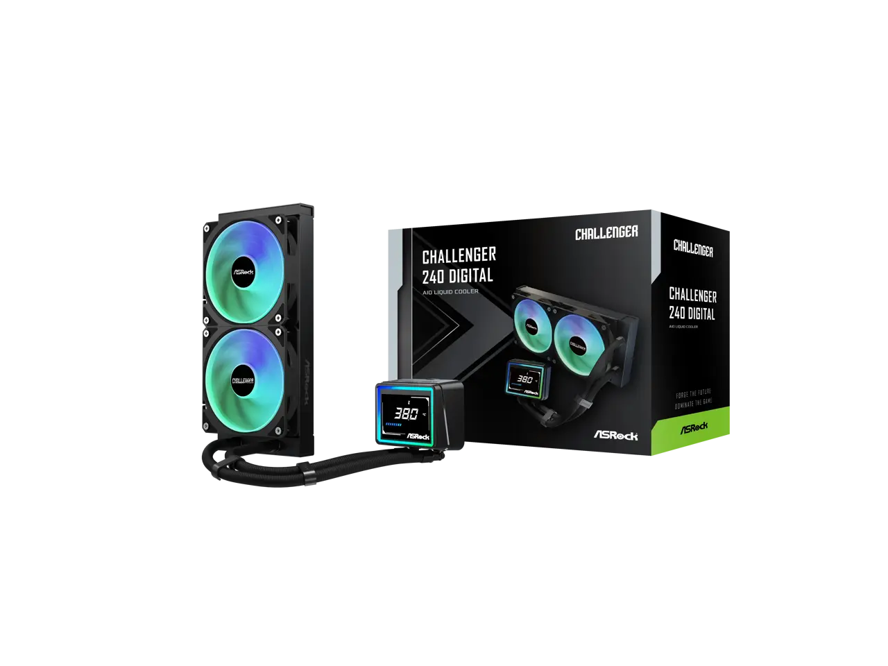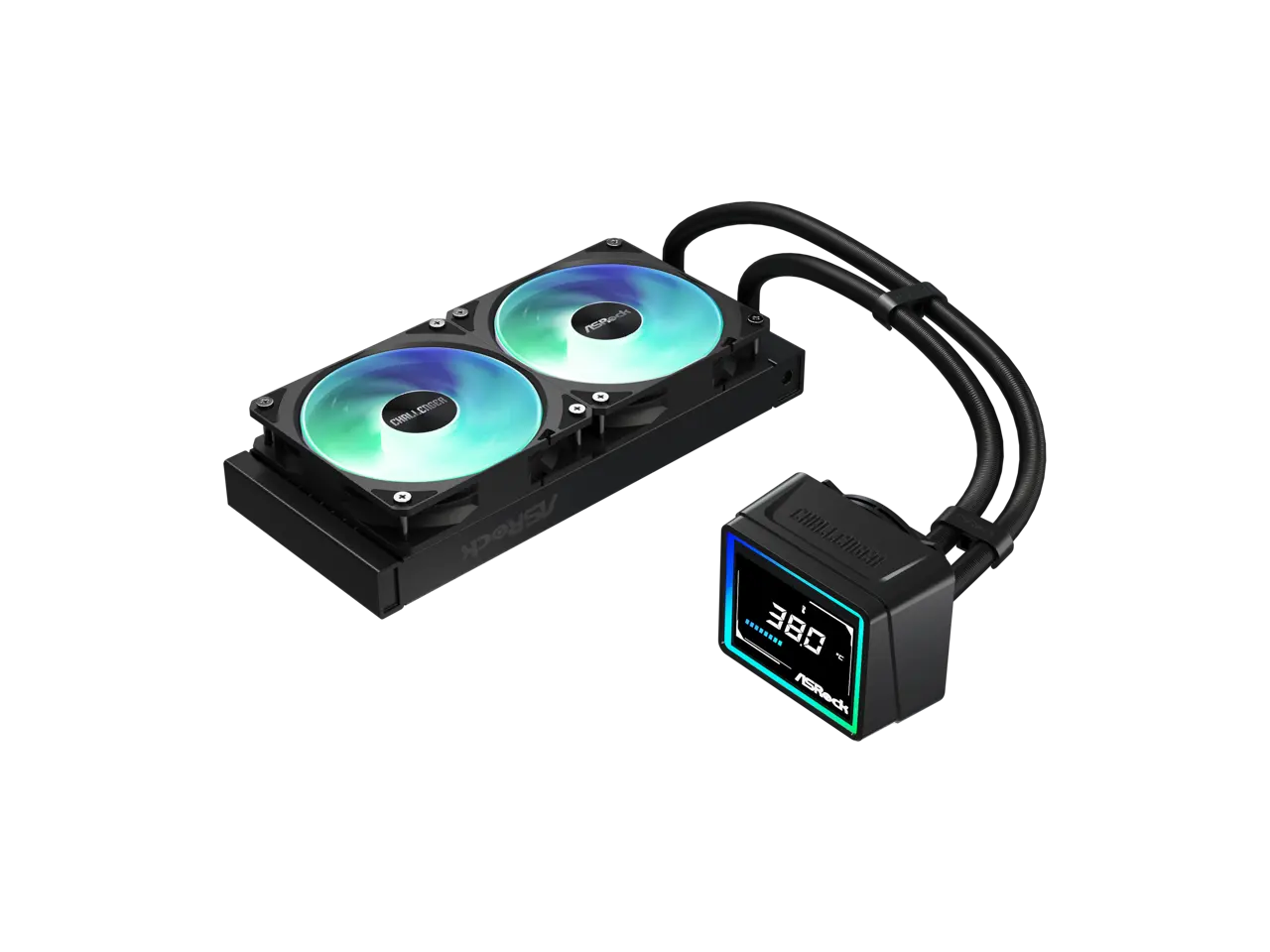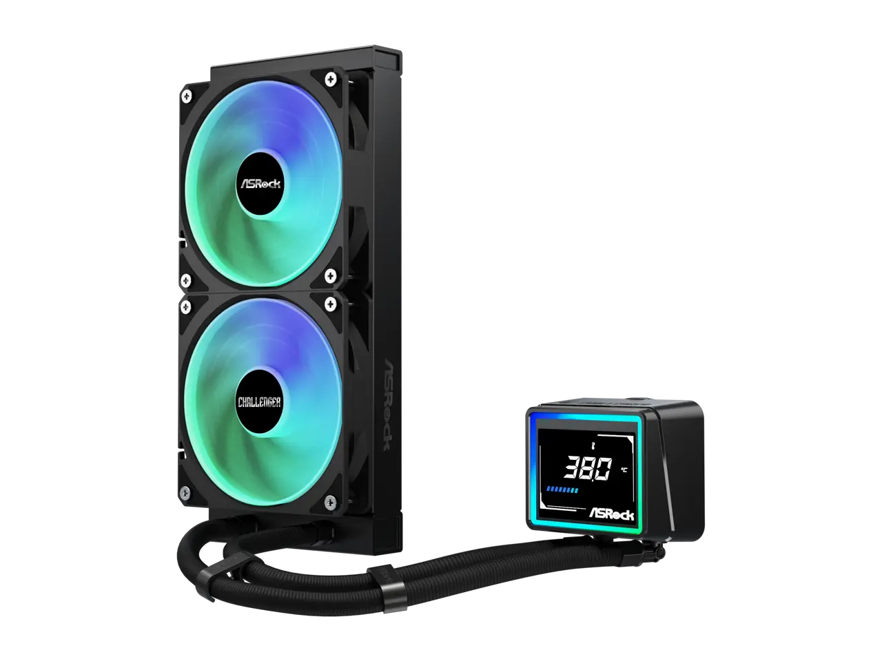 ASRock AIO Challenger 240 Digital 27mm radiator, 3" Digital Display w/ ARGB, ARGB Hub-lighting fan, black version