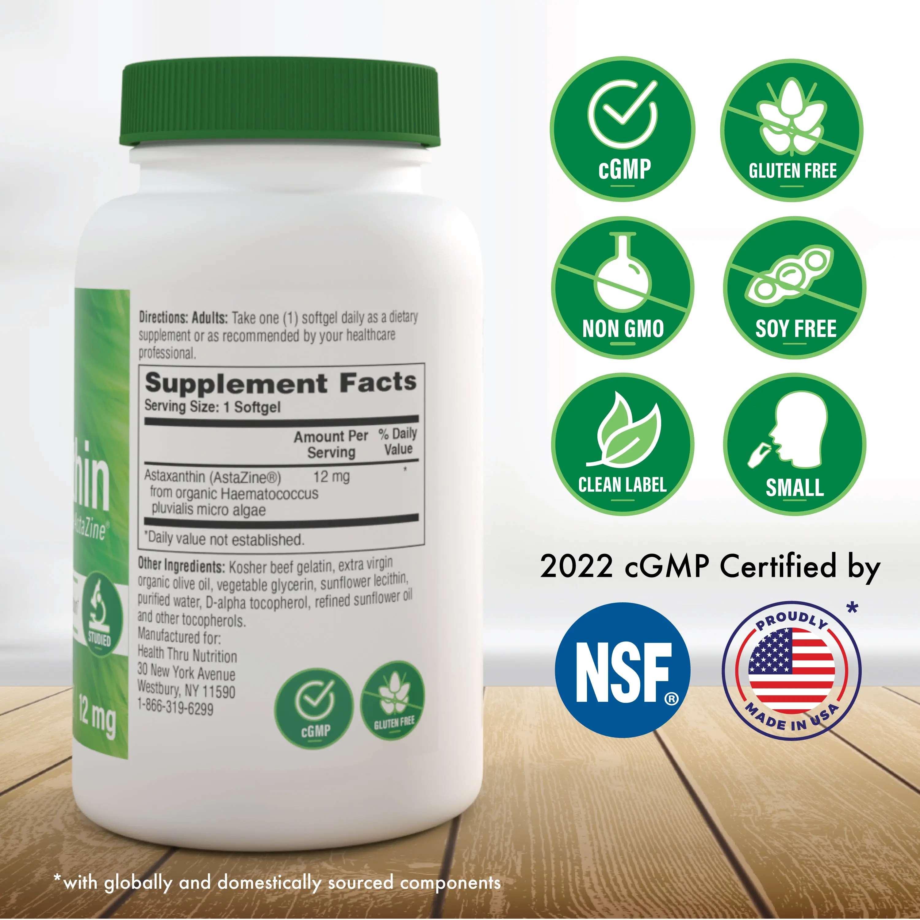 Health Thru Nutrition Astaxanthin 12 mg is a natural dietary supplement featuring AstaZine, a form of astaxanthin derived from microalgae. Grown in carefully controlled environments using Himalayan water, this astaxanthin is produced to maintain its natural integrity.