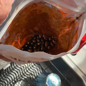 Package was crushed & dirty. Orange liquid on bag like ink. Requesting a refund
