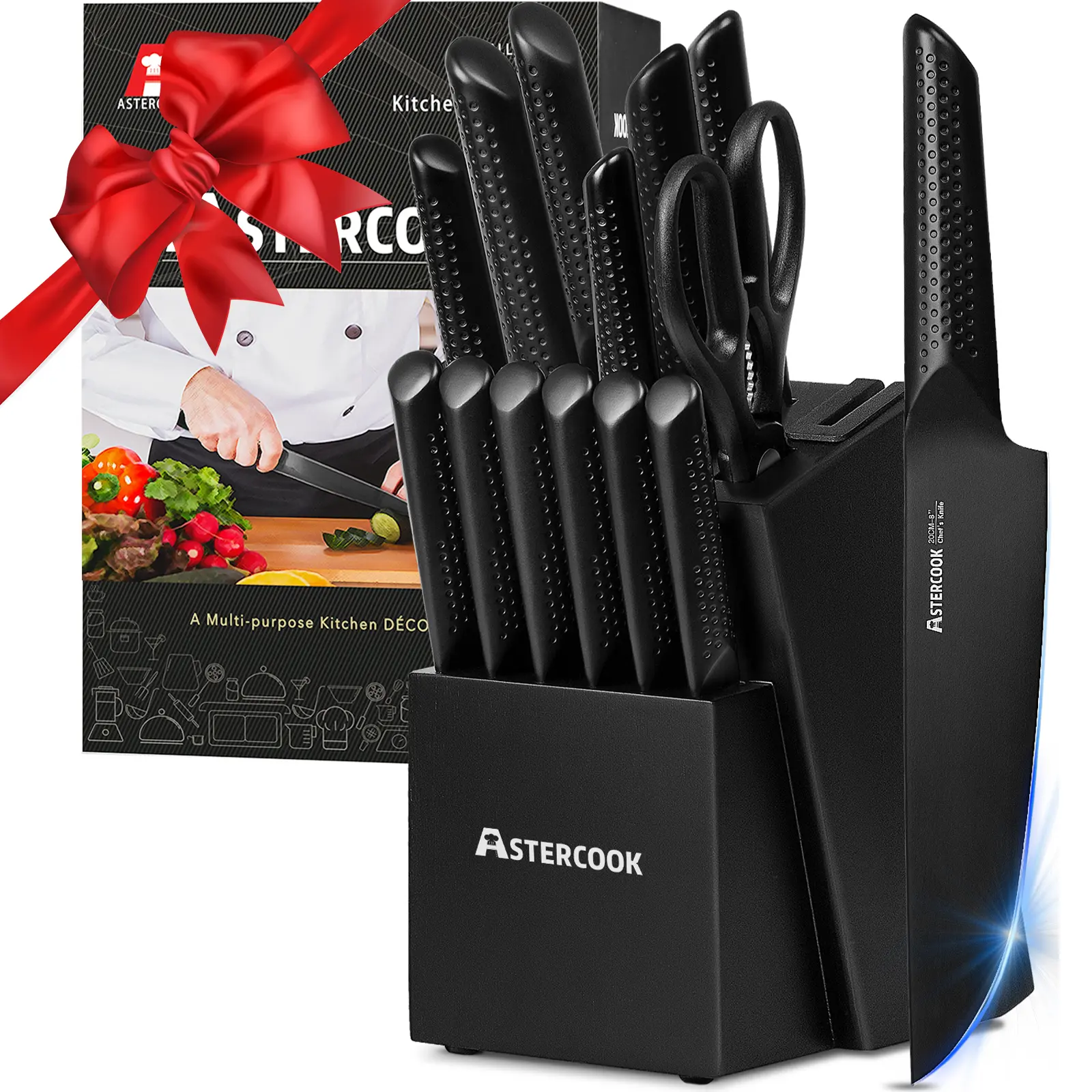 Elevate your kitchen with the Astercook Knife Set with Wood Block, a comprehensive chef kitchen knife set designed for efficiency and safety. This set includes 15 pieces of high-quality kitchen knives, ensuring you have everything you need for your cooking needs.