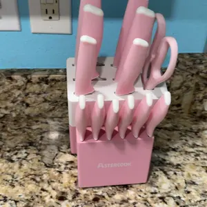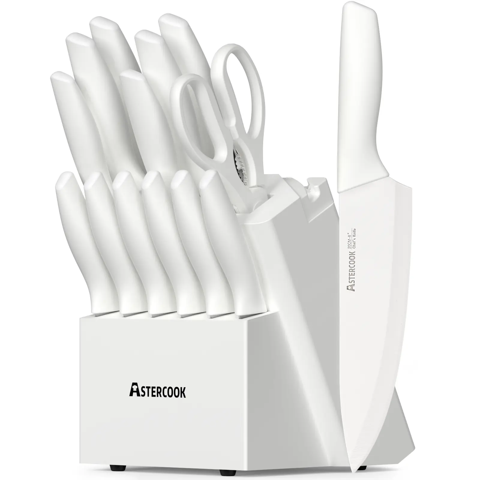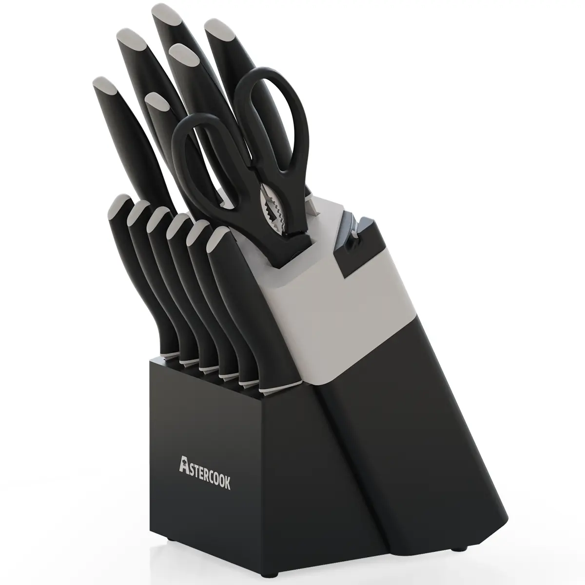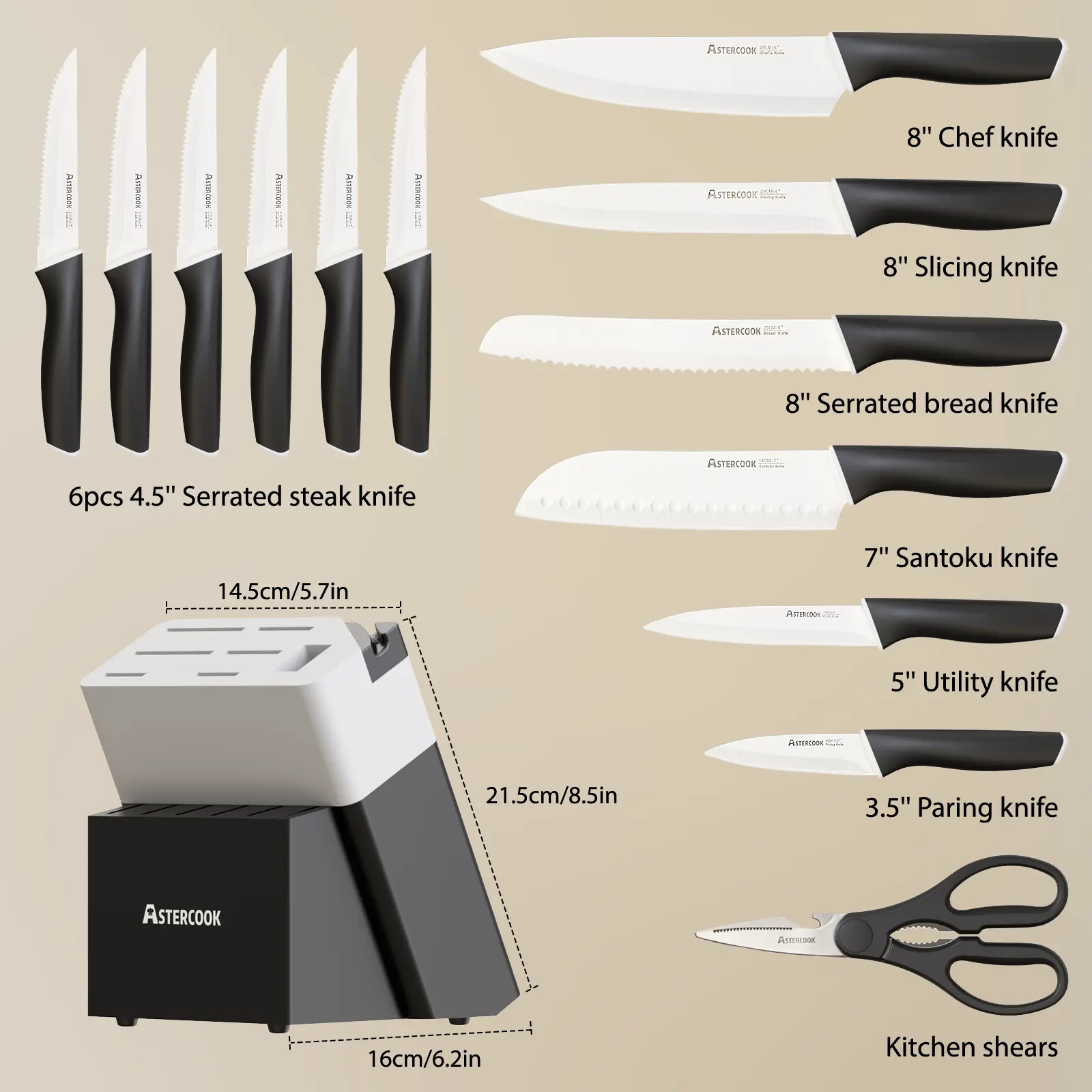 ·【HIGH VALUE 15 PCS KNIFE SET】:8" Chef knife, 8" Slicing knife, 7" Santoku knife, 8" Serrated bread knife, 5" Utility knife, 3.5" Paring knife, 6 Pcs 4.5" serrated steak knife, 1 Pcs kitchen shear, and Black hard wood knife block with built-in knife sharpener.This knife set is designed to tackle any kitchen task, from chopping vegetables to carving meat.