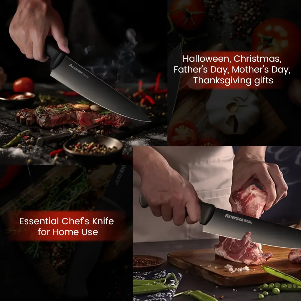 ·Versatile Cutting Tool: The Astercook 8-inch chef's knife is a multi-purpose cutting tool, perfect for professional chefs and home cooks. Its titanium coating ensures durability and ease of maintenance. Ideal for various kitchen tasks.