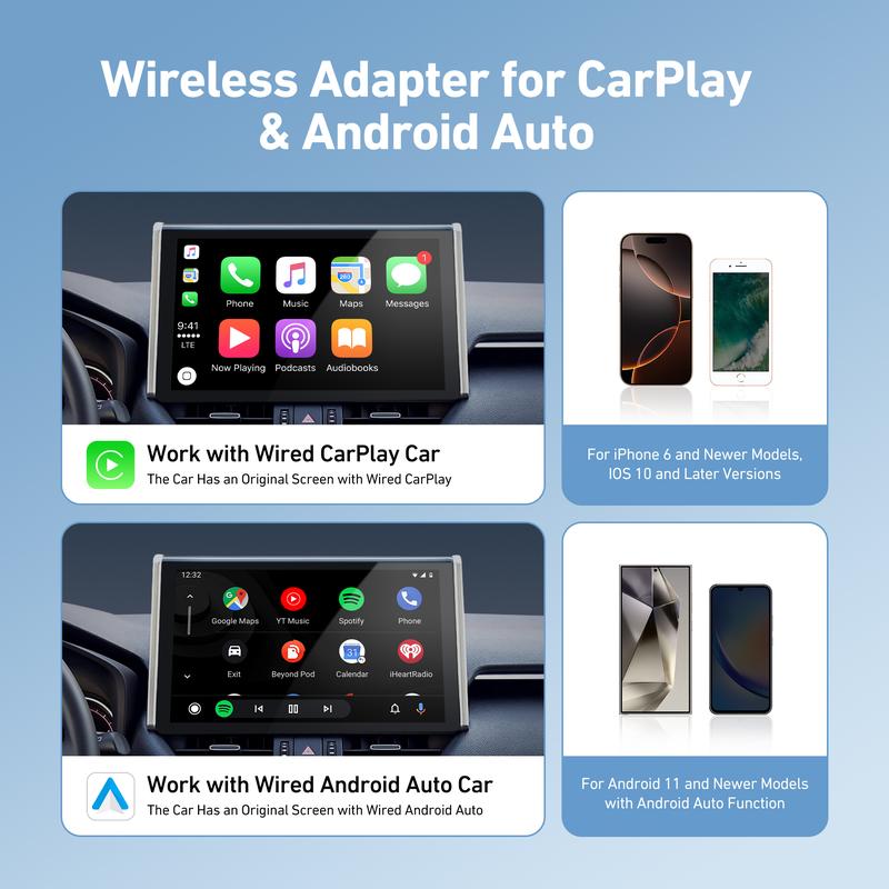 ·Wide Compatibility: Compatible with iPhones (iPhone 6 or later, iOS 10+) and Android phones (Android 11.0+), supporting over 98% of car models. Enjoy seamless compatibility and safe wireless driving.